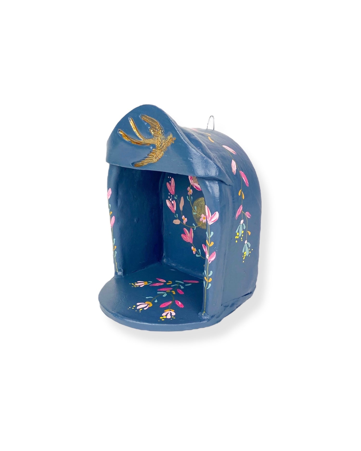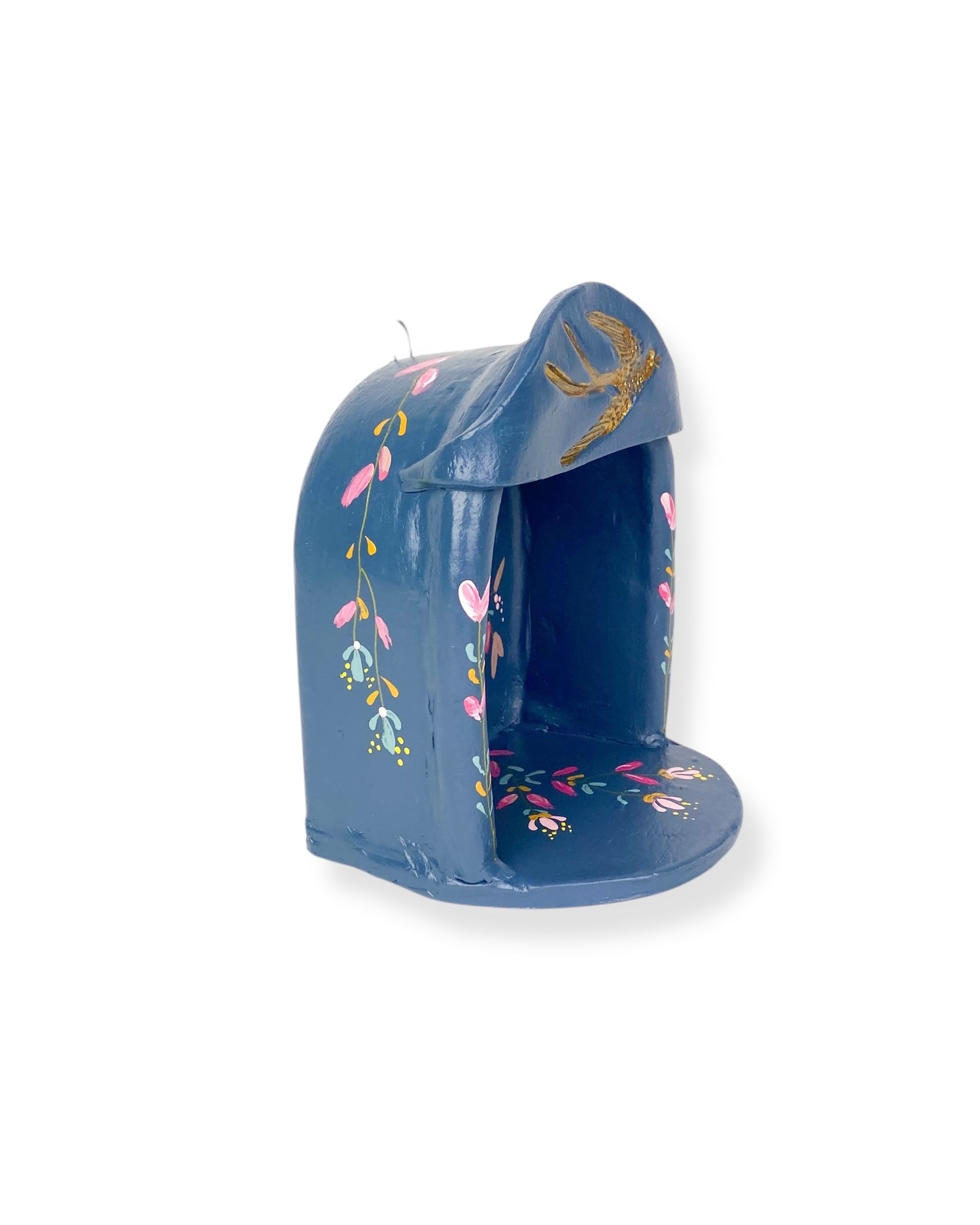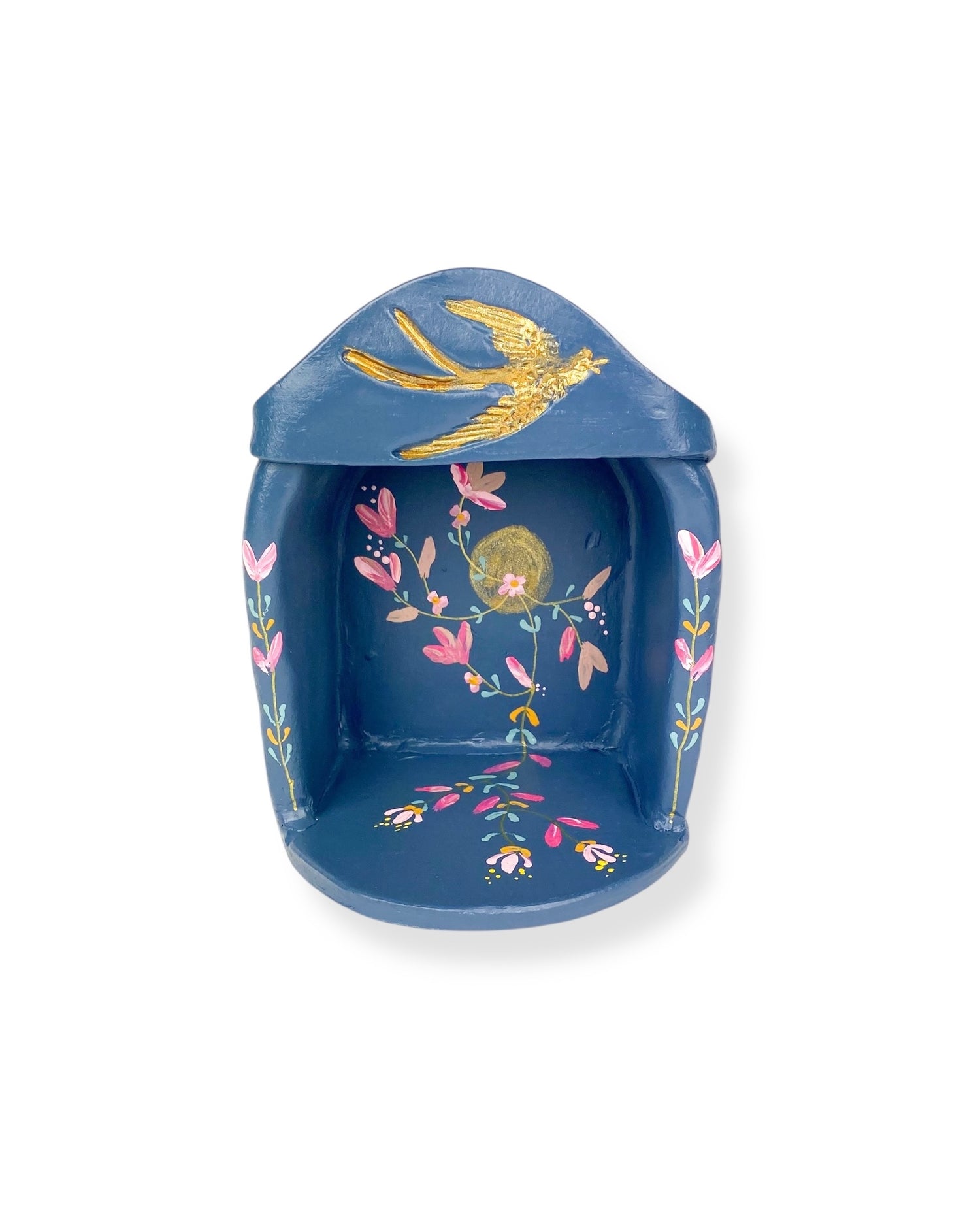 Dit altaar is een kunstwerk voor aan de muur. Het is volledig met de hand gemaakt van klei, door shopeigenaresse Irma in ons atelier in Haps. Het altaar is versierd met nachtblauwe schilderingen, bloemen en een gouden zwaluw. Het heeft een haakje waarmee je het kan ophangen aan de muur. Creëer een eigen plekje in huis voor bezinning met een huisaltaar of geef het een mooi plekje aan de muur en combineer het met andere handgemaakte wanddecoratie zoals een wandtegeltje, wandbord of mini nisje.