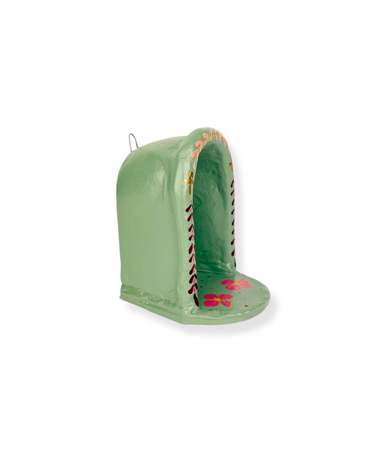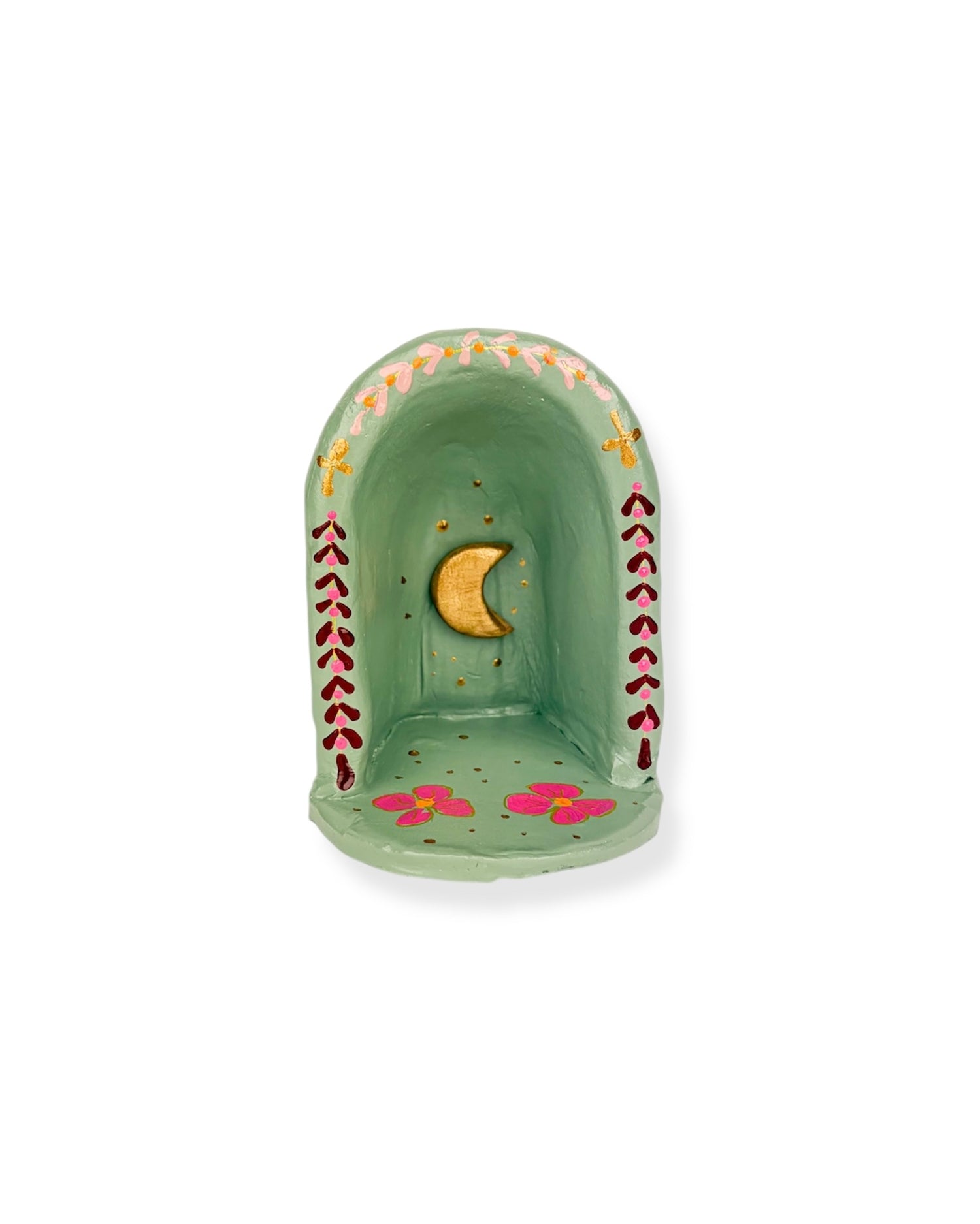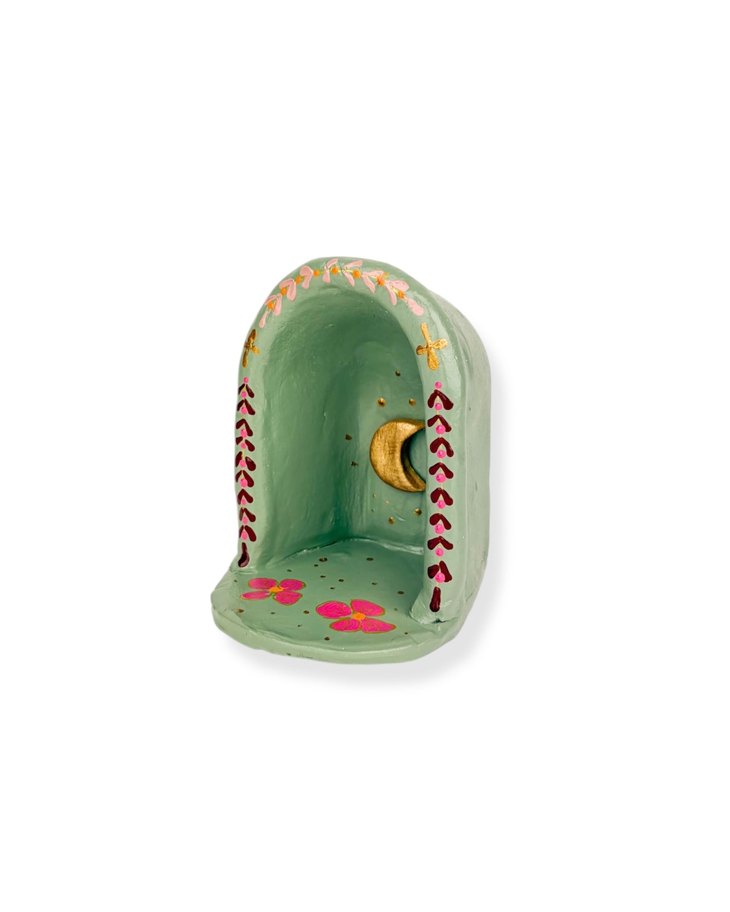 Dit altaar is een kunstwerk voor aan de muur. Het is volledig met de hand gemaakt van klei, door shopeigenaresse Irma in ons atelier in Haps. Het altaar is versierd met pastel groene schilderingen, bloemen en een gouden maan. Het heeft een haakje waarmee je het kan ophangen aan de muur. Creëer een eigen plekje in huis voor bezinning met een huisaltaar of geef het een mooi plekje aan de muur en combineer het met andere handgemaakte wanddecoratie zoals een wandtegeltje, wandbord of mini nisje.