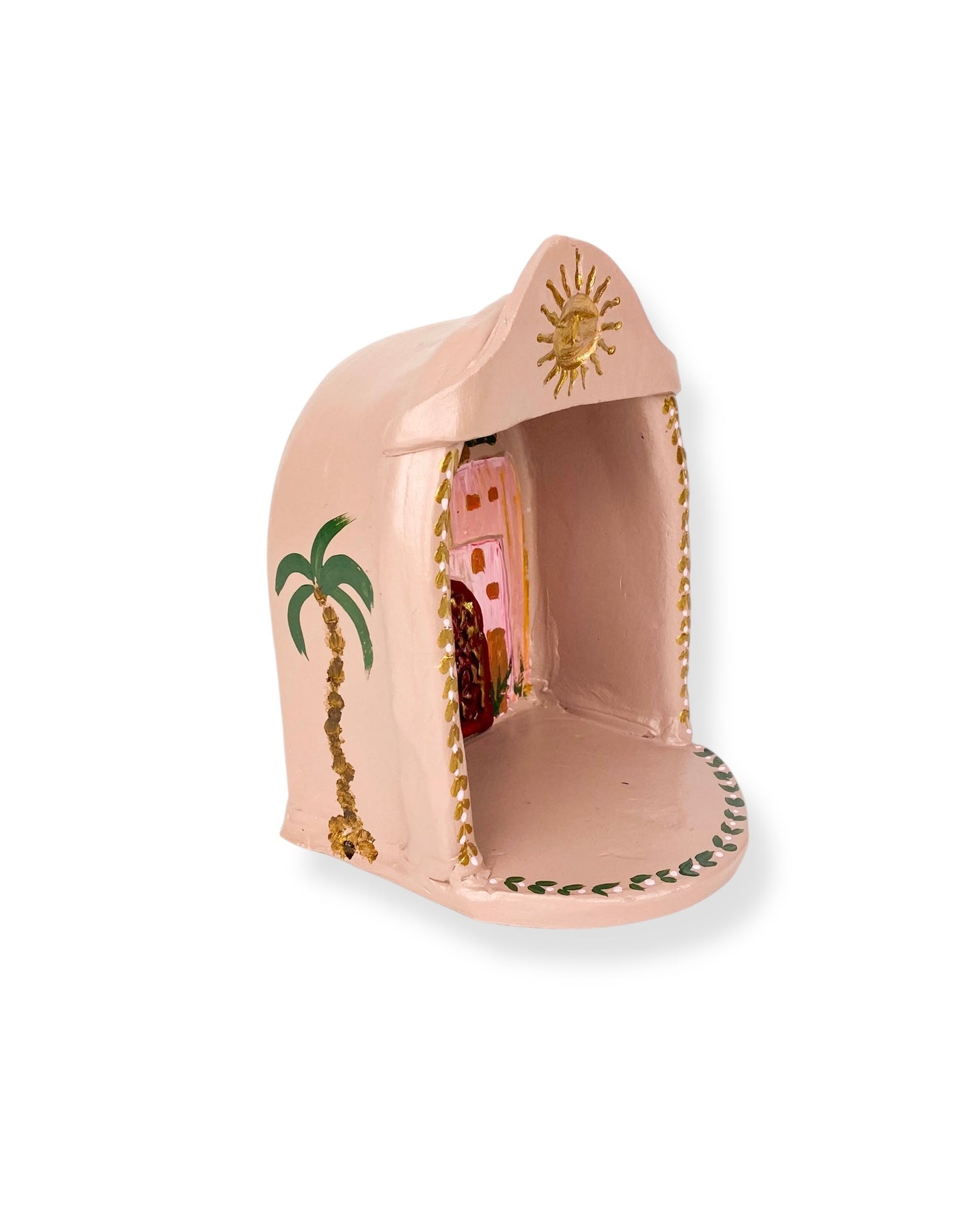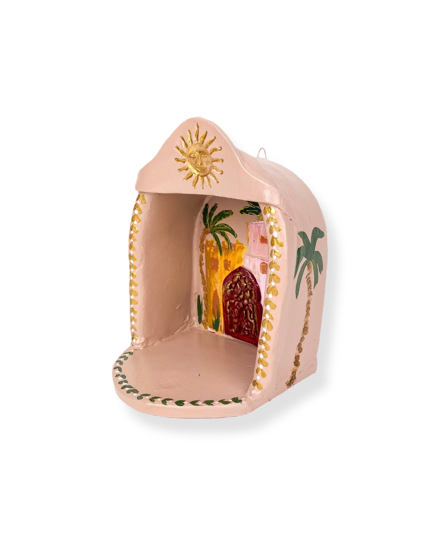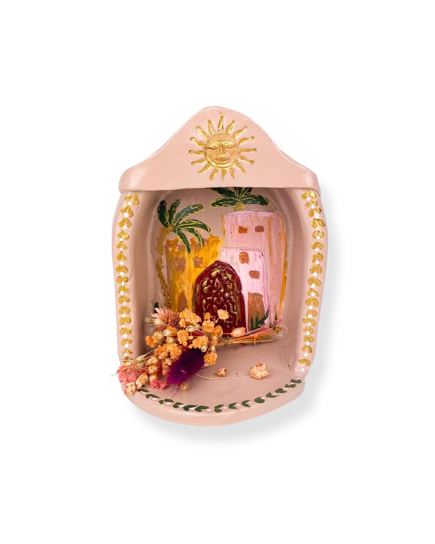 Dit altaar is een kunstwerk voor aan de muur. Het is volledig met de hand gemaakt van klei, door shopeigenaresse Irma in ons atelier in Haps. Het altaar is versierd met roze schilderingen, een Marokkaans doorkijkje en een gouden zon. Het heeft een haakje waarmee je het kan ophangen aan de muur. Creëer een eigen plekje in huis voor bezinning met een huisaltaar of geef het een mooi plekje aan de muur en combineer het met andere handgemaakte wanddecoratie zoals een wandtegeltje, wandbord of mini nisje.