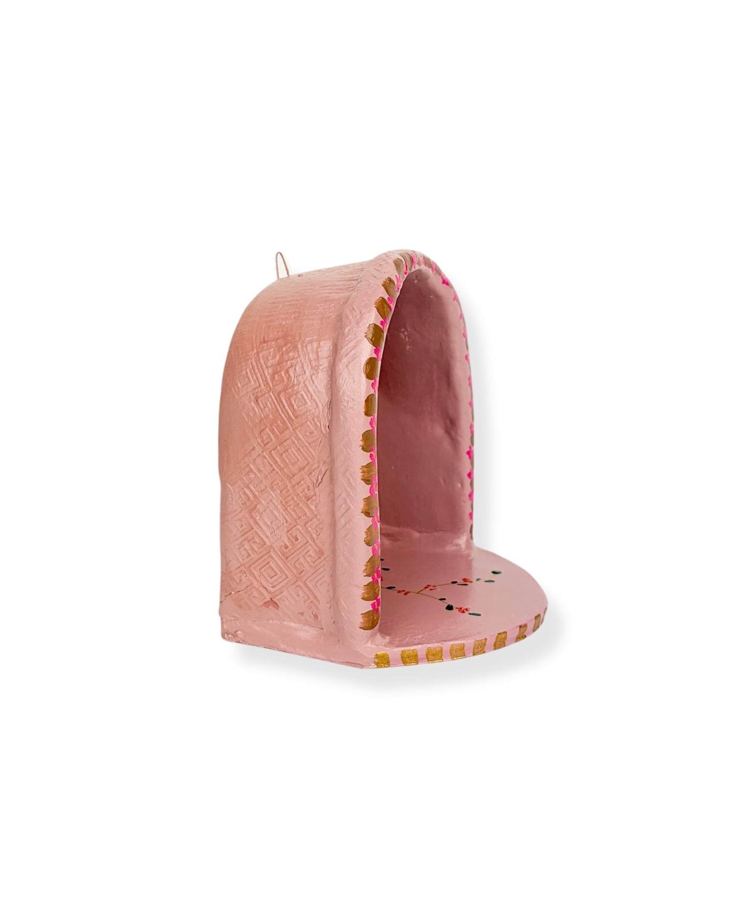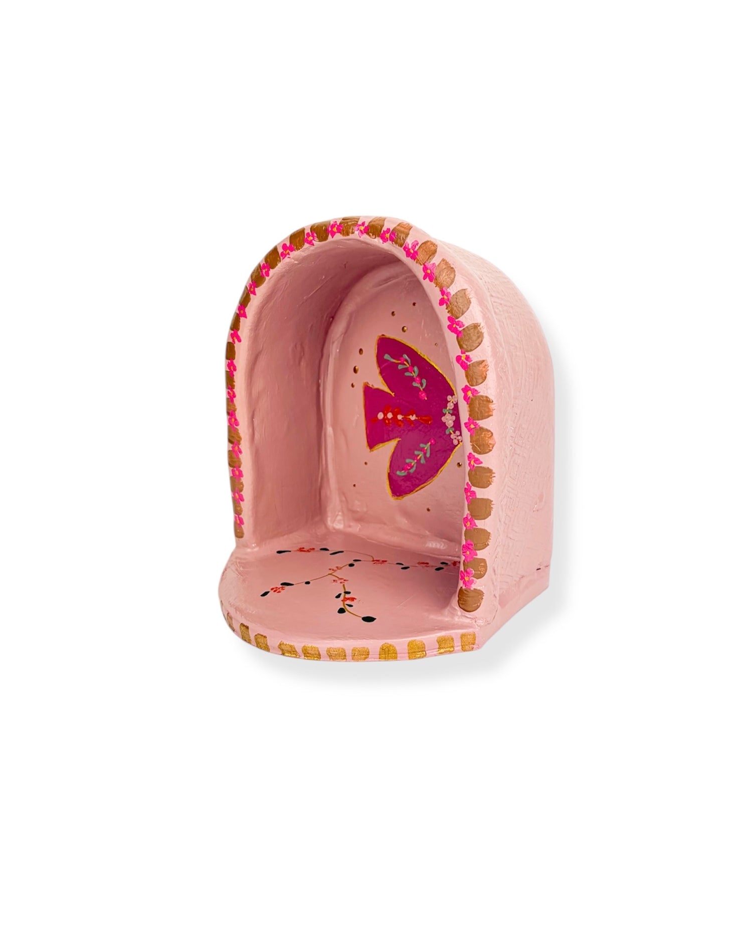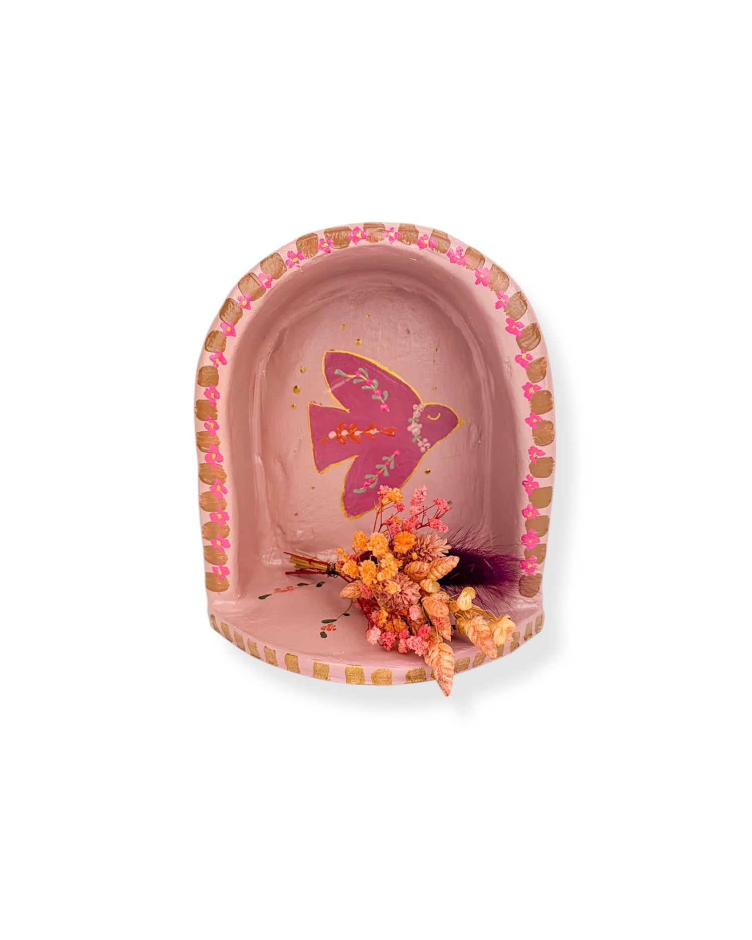 Dit altaar is een kunstwerk voor aan de muur. Het is volledig met de hand gemaakt van klei, door shopeigenaresse Irma in ons atelier in Haps. Het altaar is versierd met roze schilderingen, bloemen en een zwaluw. Het heeft een haakje waarmee je het kan ophangen aan de muur. Creëer een eigen plekje in huis voor bezinning met een huisaltaar of geef het een mooi plekje aan de muur en combineer het met andere handgemaakte wanddecoratie zoals een wandtegeltje, wandbord of mini nisje.