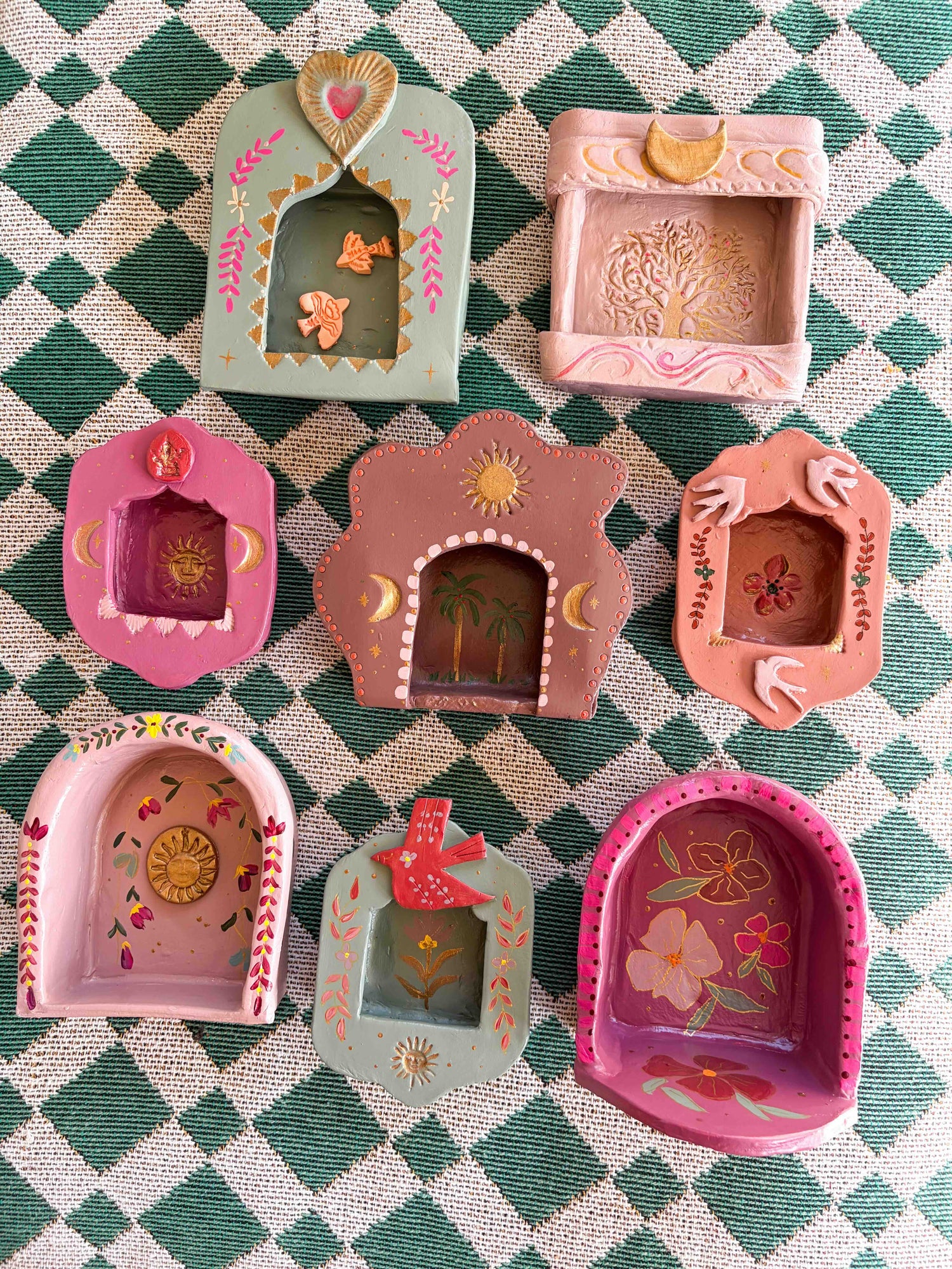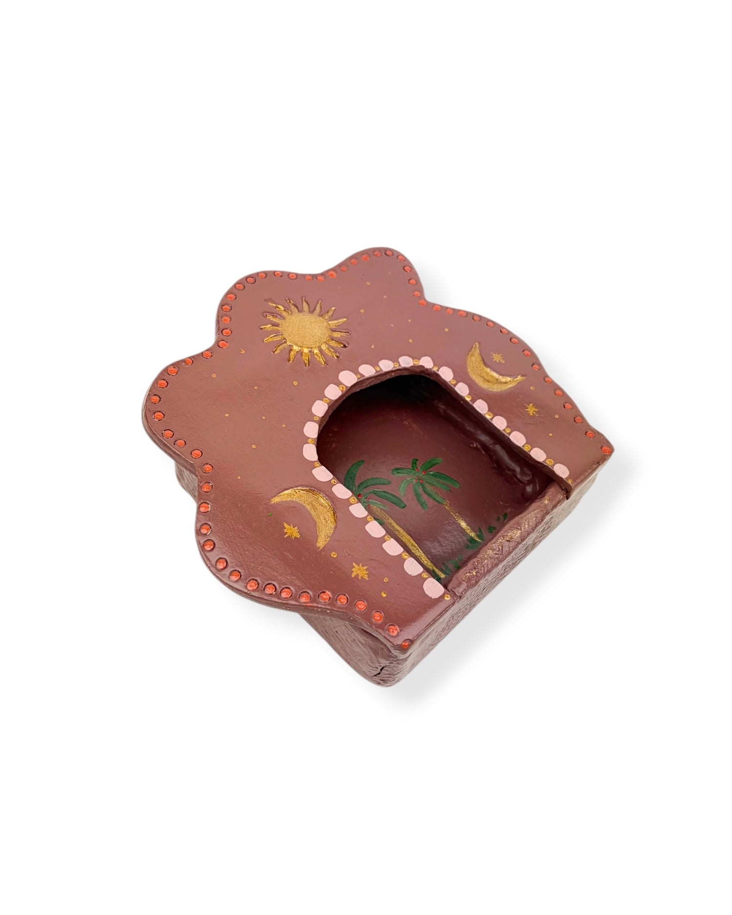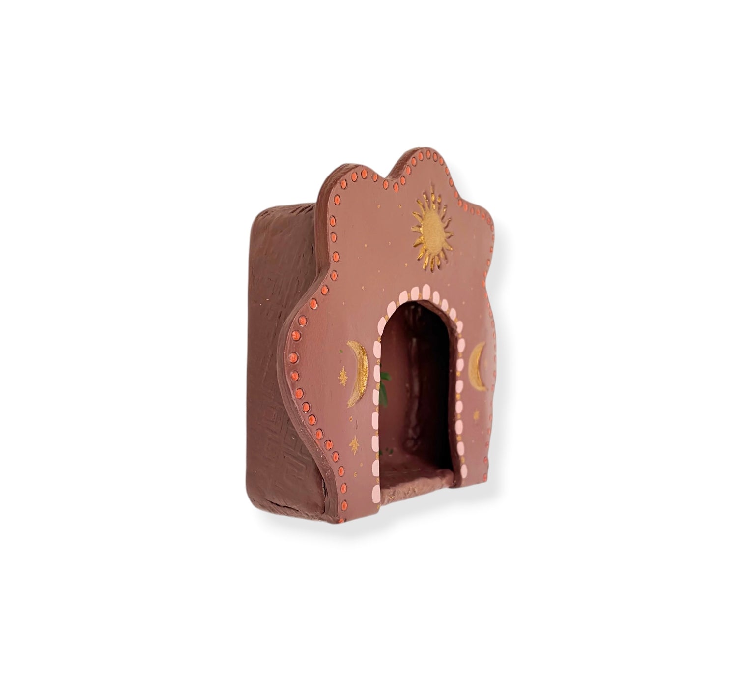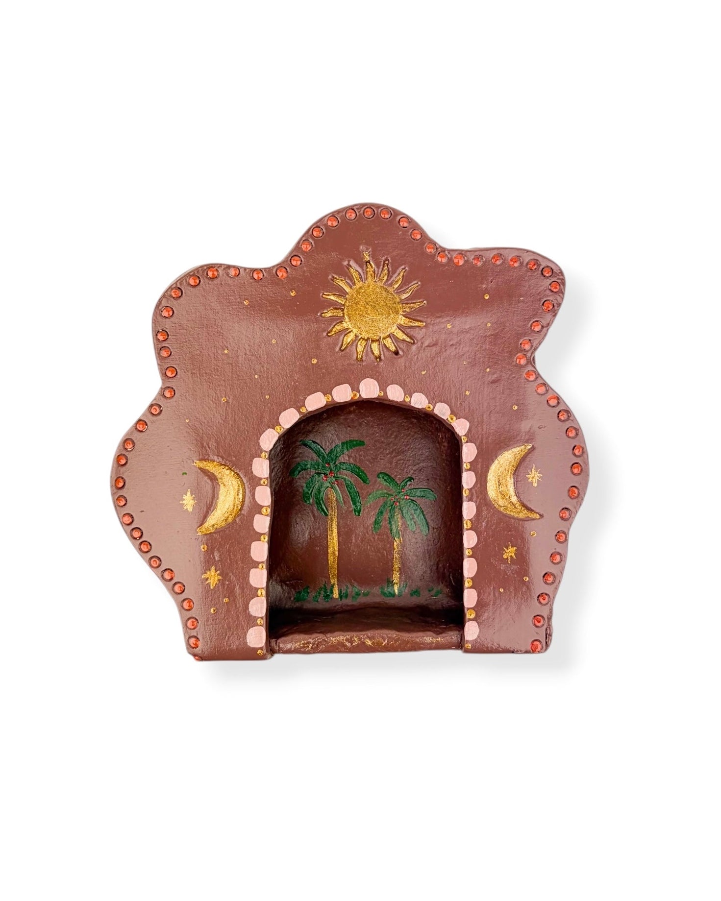 Dit altaar is een kunstwerk voor aan de muur. Het is volledig met de hand gemaakt van klei, door shopeigenaresse Irma in ons atelier in Haps. Het altaar is versierd met roze/bruine schilderingen, een zon en gouden maantjes. Het heeft een haakje waarmee je het kan ophangen aan de muur. Creëer een eigen plekje in huis voor bezinning met een huisaltaar of geef het een mooi plekje aan de muur en combineer het met andere handgemaakte wanddecoratie zoals een wandtegeltje, wandbord of mini nisje.