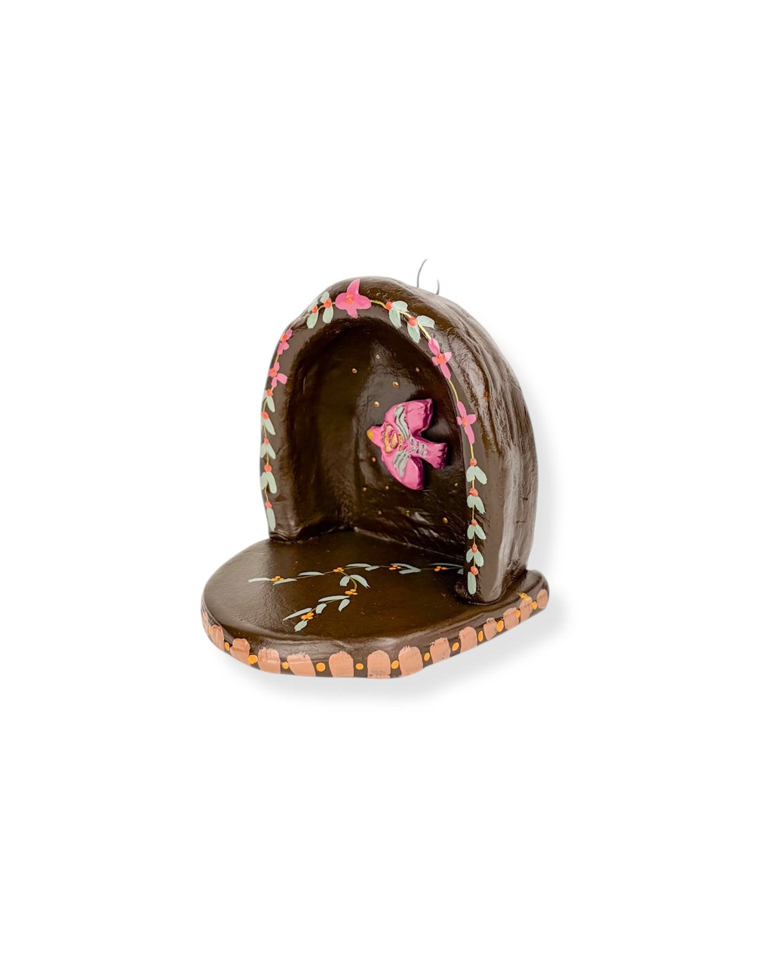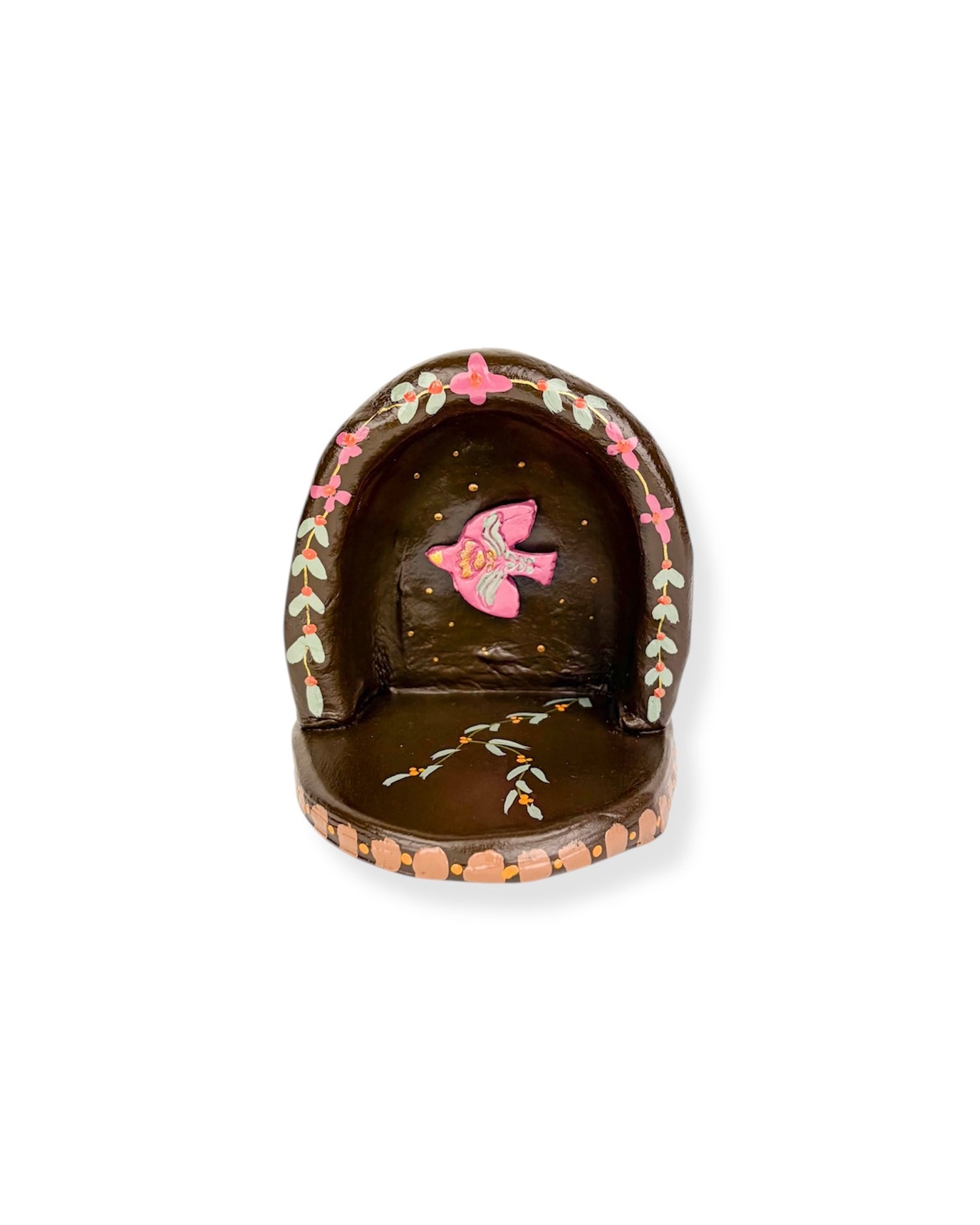 Dit altaar is een kunstwerk voor aan de muur. Het is volledig met de hand gemaakt van klei, door shopeigenaresse Irma in ons atelier in Haps. Het altaar is versierd met donker bruine schilderingen, bloemen en een zwaluw. Het heeft een haakje waarmee je het kan ophangen aan de muur. Creëer een eigen plekje in huis voor bezinning met een huisaltaar of geef het een mooi plekje aan de muur en combineer het met andere handgemaakte wanddecoratie zoals een wandtegeltje, wandbord of mini nisje.