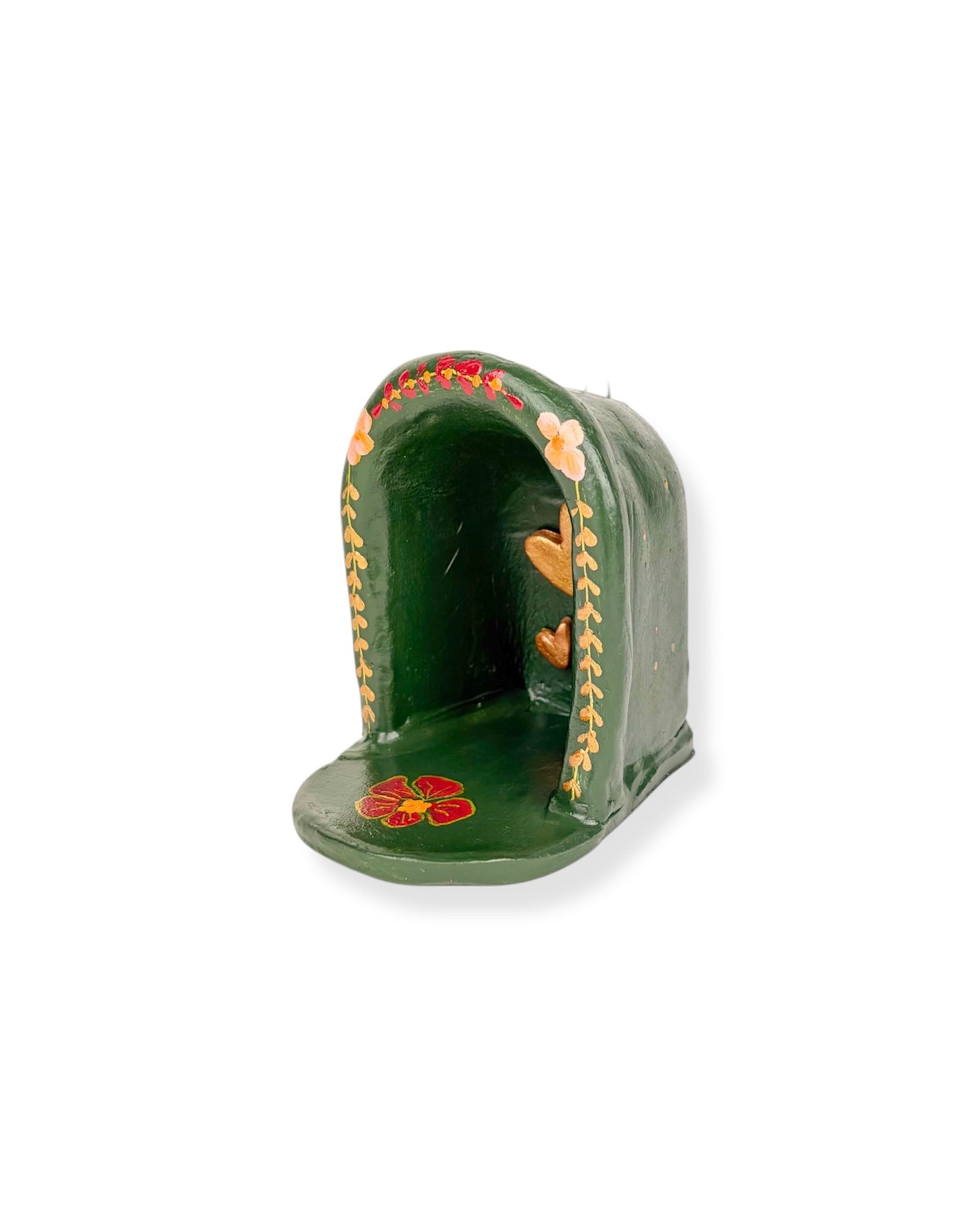 Dit altaar is een kunstwerk voor aan de muur. Het is volledig met de hand gemaakt van klei, door shopeigenaresse Irma in ons atelier in Haps. Het altaar is versierd met donker groene schilderingen, bloemen en gouden hartjes. Het heeft een haakje waarmee je het kan ophangen aan de muur. Creëer een eigen plekje in huis voor bezinning met een huisaltaar of geef het een mooi plekje aan de muur en combineer het met andere handgemaakte wanddecoratie zoals een wandtegeltje, wandbord of mini nisje.
