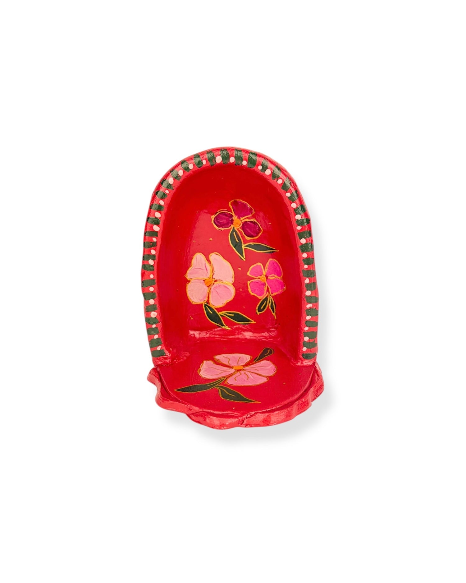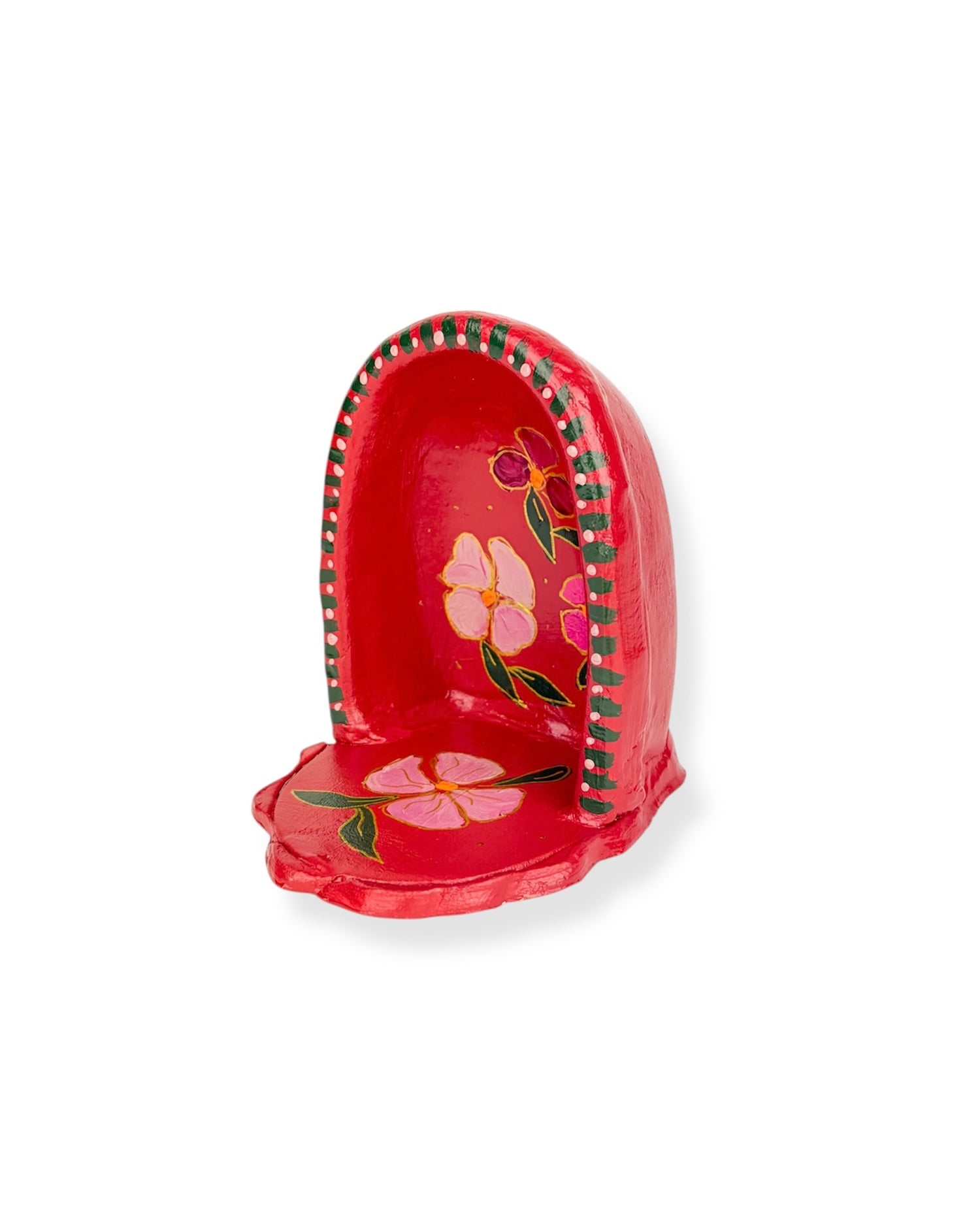 Dit altaar is een kunstwerk voor aan de muur. Het is volledig met de hand gemaakt van klei, door shopeigenaresse Irma in ons atelier in Haps. Het altaar is versierd met rode schilderingen en bloemen. Het heeft een haakje waarmee je het kan ophangen aan de muur. Creëer een eigen plekje in huis voor bezinning met een huisaltaar of geef het een mooi plekje aan de muur en combineer het met andere handgemaakte wanddecoratie zoals een wandtegeltje, wandbord of mini nisje.