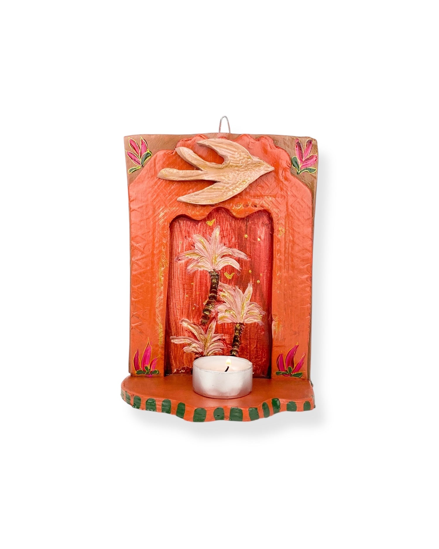 Dit altaar is een kunstwerk voor aan de muur. Het is volledig met de hand gemaakt van klei, door shopeigenaresse Irma in ons atelier in Haps. Het altaar is versierd met terracotta/rode schilderingen, palmbomen en een zwaluw. Het heeft een haakje waarmee je het kan ophangen aan de muur. Creëer een eigen plekje in huis voor bezinning met een huisaltaar of geef het een mooi plekje aan de muur en combineer het met andere handgemaakte wanddecoratie zoals een wandtegeltje, wandbord of mini nisje.