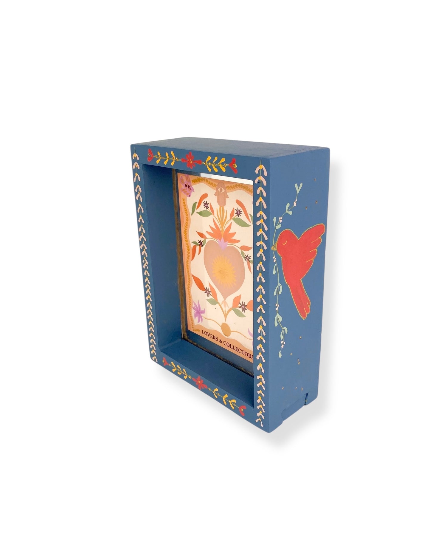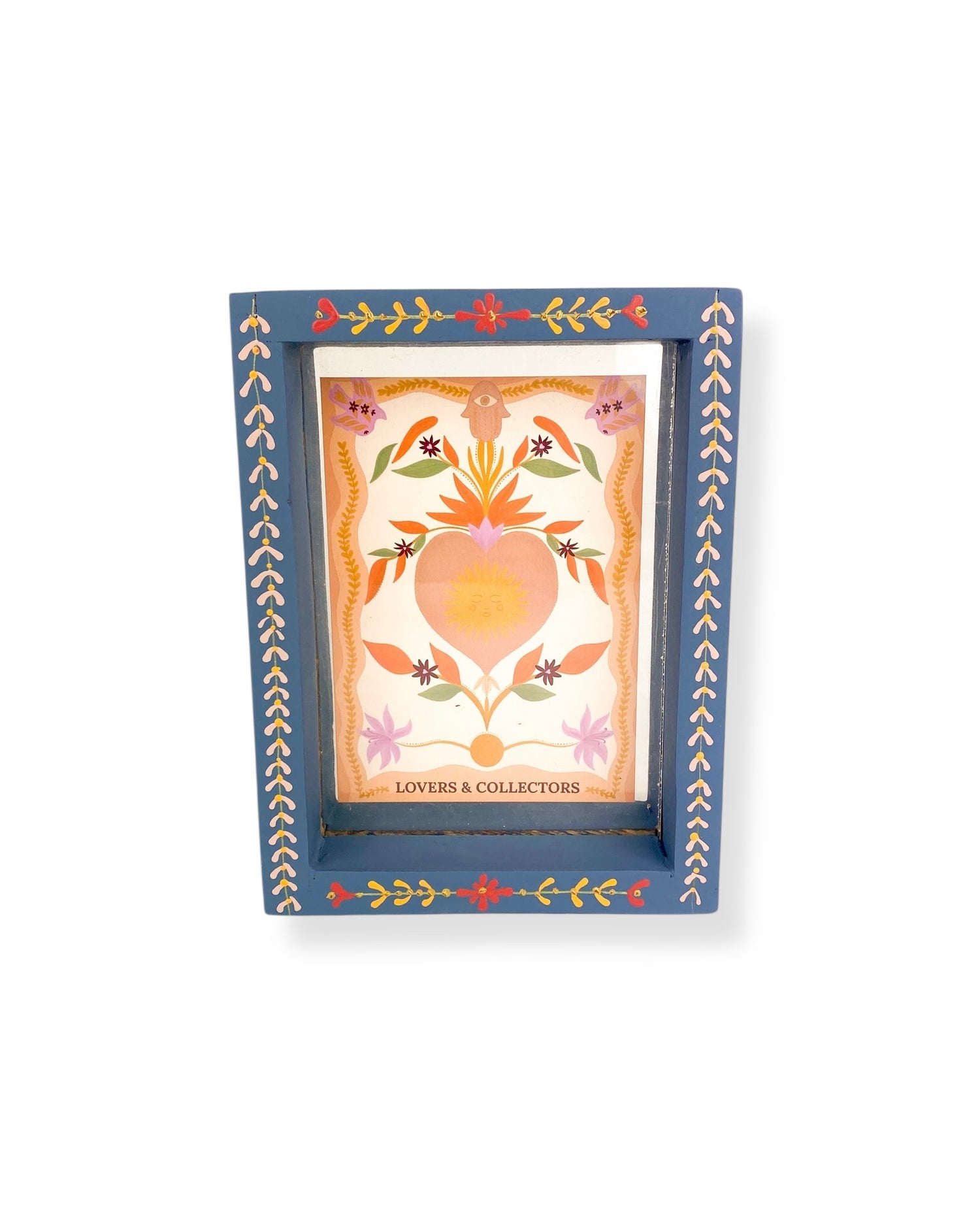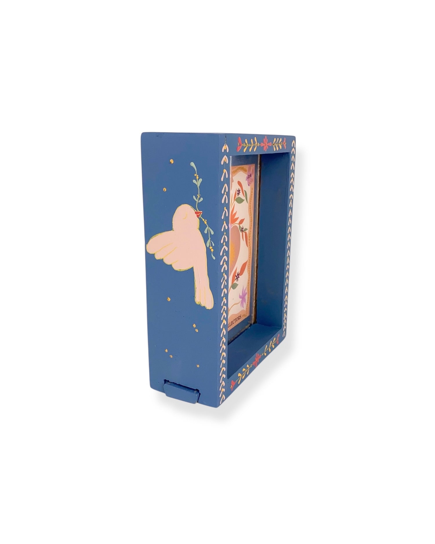 Deze fotolijst is een kunstwerk voor aan de muur of om neer te zetten. Hij is gemaakt van hout en versierd met roze en lila schilderingen. Geef de fotolijst een mooi plekje in huis of combineer het met andere handgemaakte wanddecoratie, zoals een wandtegeltje, mini nisje of altaar.