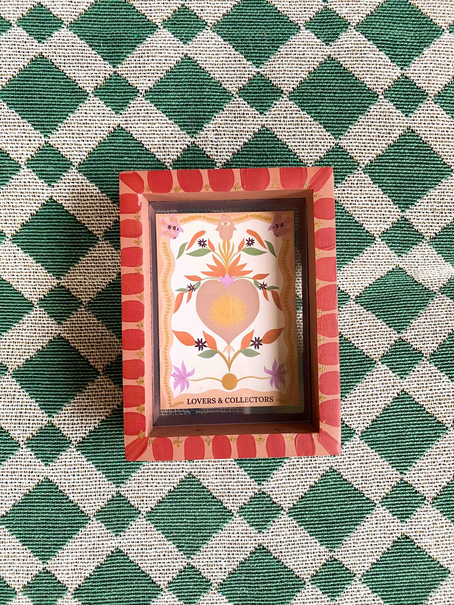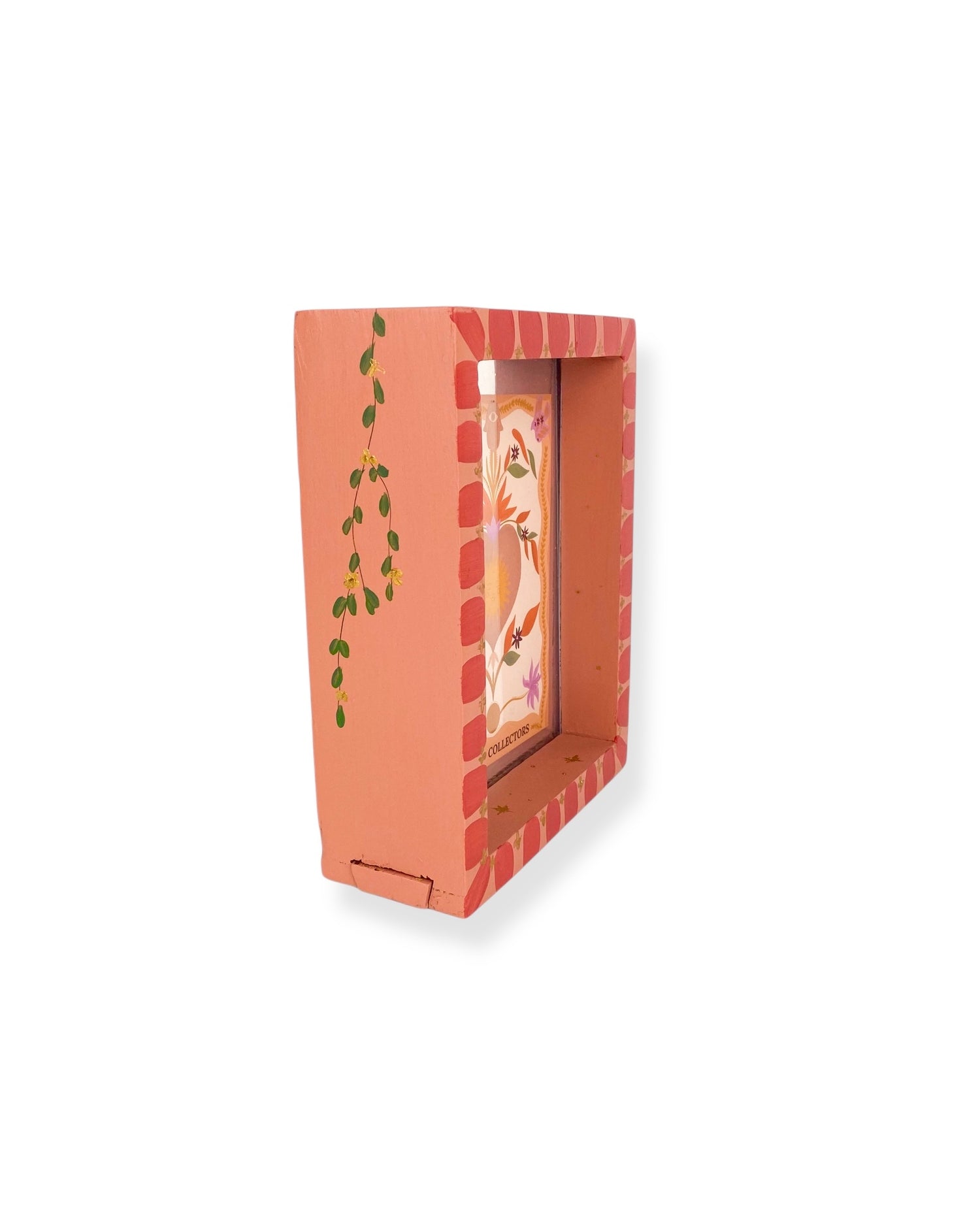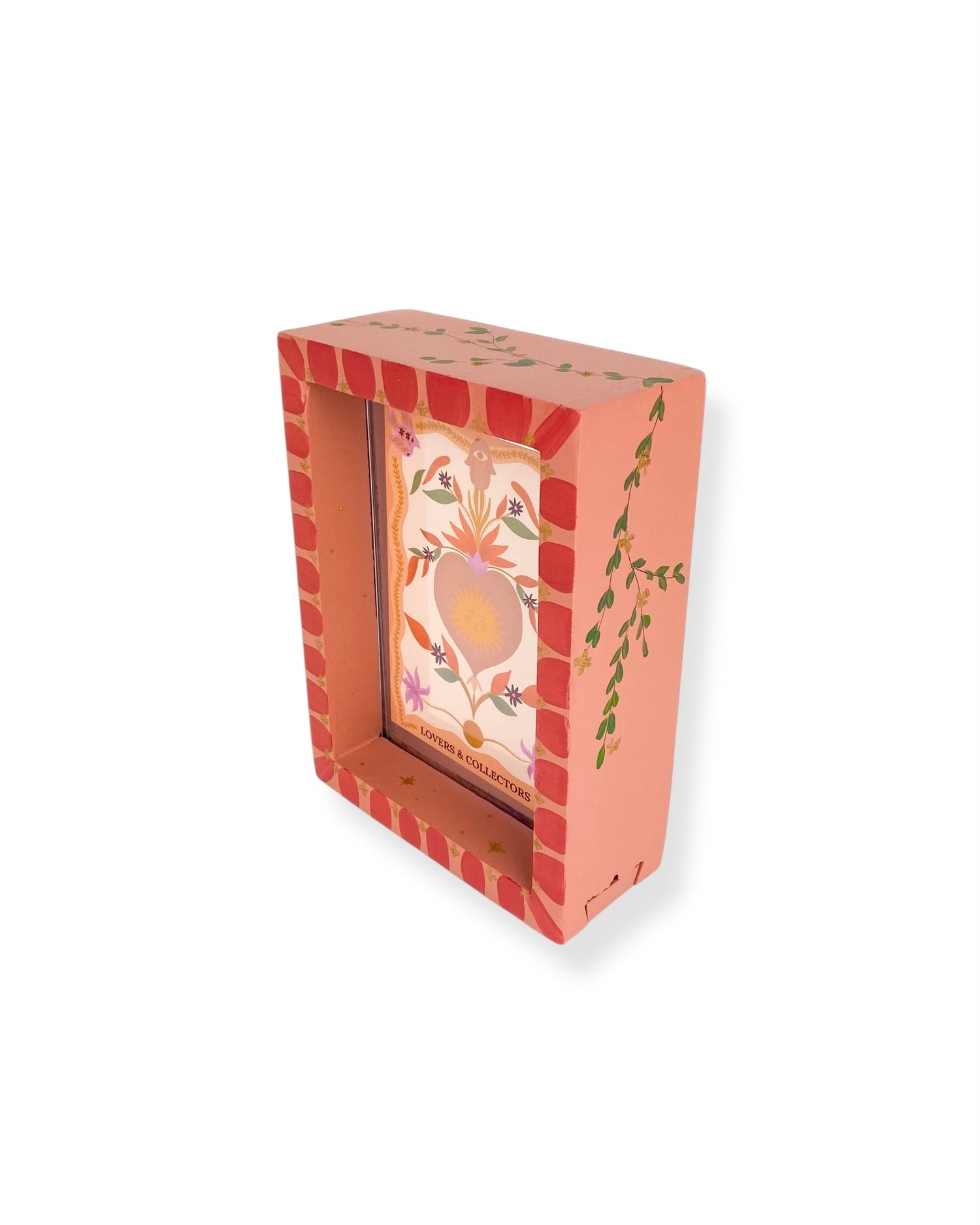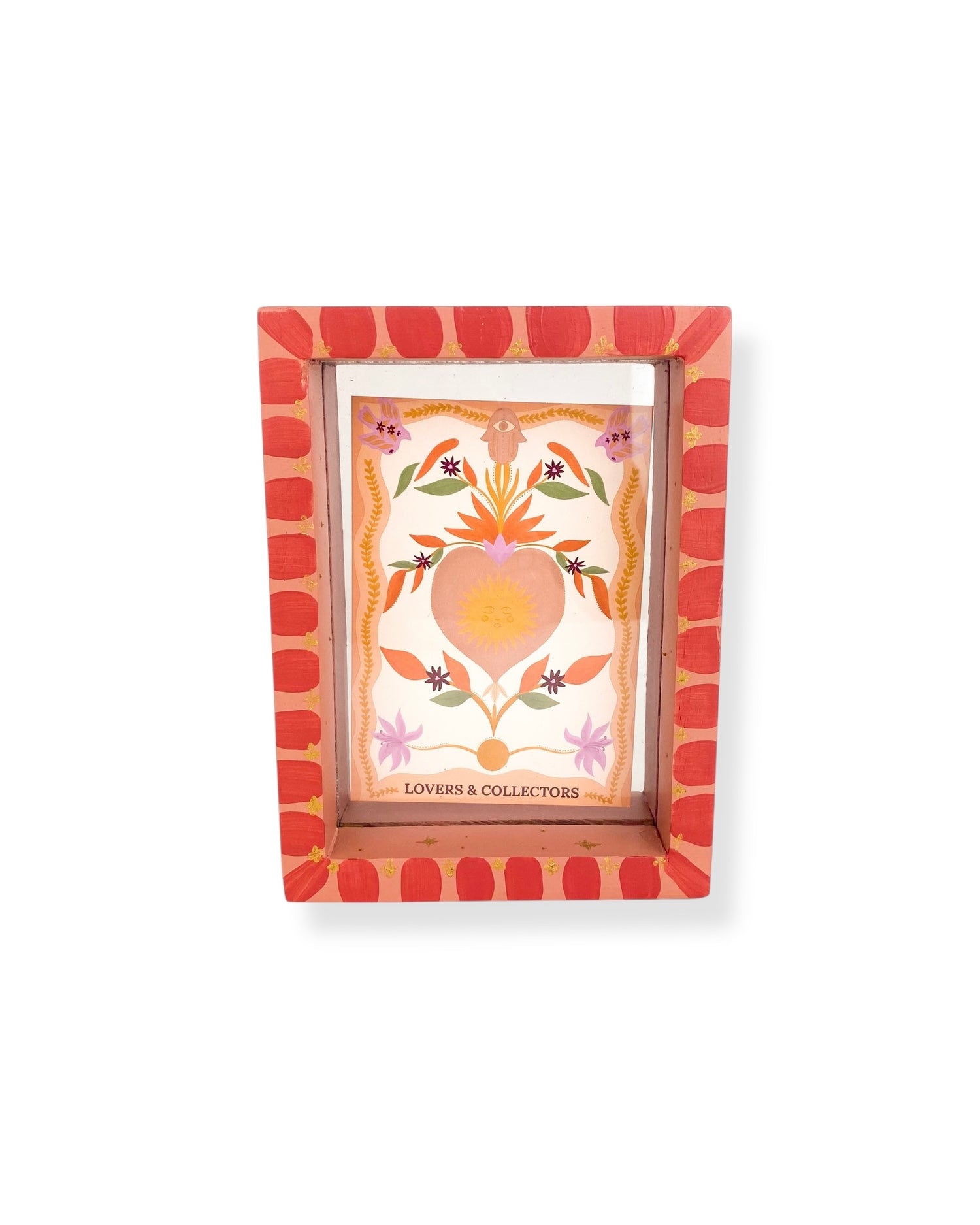 Deze fotolijst is een kunstwerk voor aan de muur of om neer te zetten. Hij is gemaakt van hout en versierd met terracotta en rode schilderingen. Geef de fotolijst een mooi plekje in huis of combineer het met andere handgemaakte wanddecoratie, zoals een wandtegeltje, mini nisje of altaar.