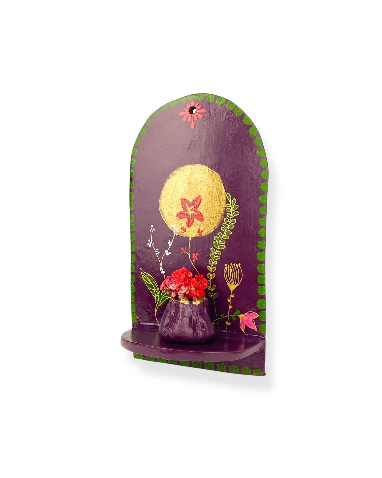 Dit muurornament is een kunstwerk voor aan de muur. Het is volledig met de hand gemaakt van klei, door shopeigenaresse Irma in ons atelier in Haps. Het is versierd met paarse schilderingen, bloemen, een gouden maan en bijpassend vaasje. Het heeft een haakje waarmee je het kan ophangen aan de muur. Geef het muurornament een mooi plekje in huis of combineer het met andere handgemaakte wanddecoratie, zoals een wandtegeltje, wandbord of altaar.
