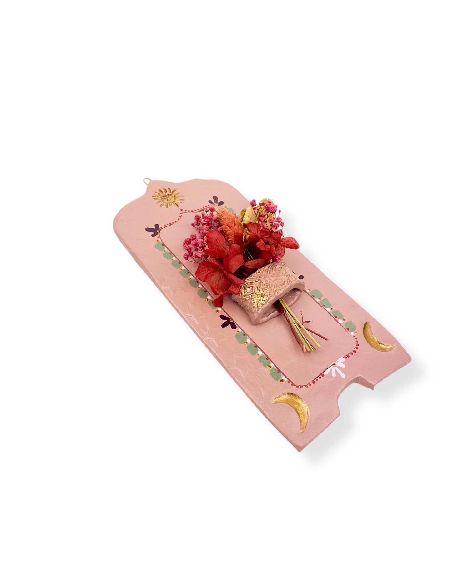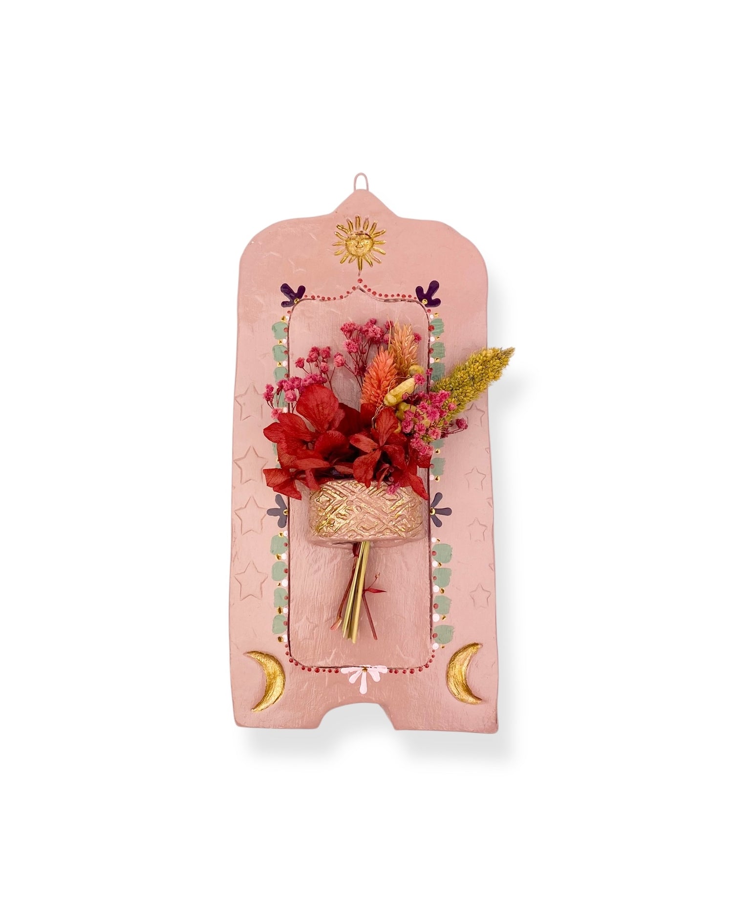 Dit muurvaasje is een kunstwerk voor aan de muur. Het is volledig met de hand gemaakt van klei, door shopeigenaresse Irma in ons atelier in Haps. Het is versierd met roze schilderingen en een bosje droogbloemen. Het heeft een haakje waarmee je het kan ophangen aan de muur. Geef het muurvaasje een mooi plekje in huis of combineer het met andere handgemaakte wanddecoratie, zoals een wandtegeltje, wandbord of altaar.