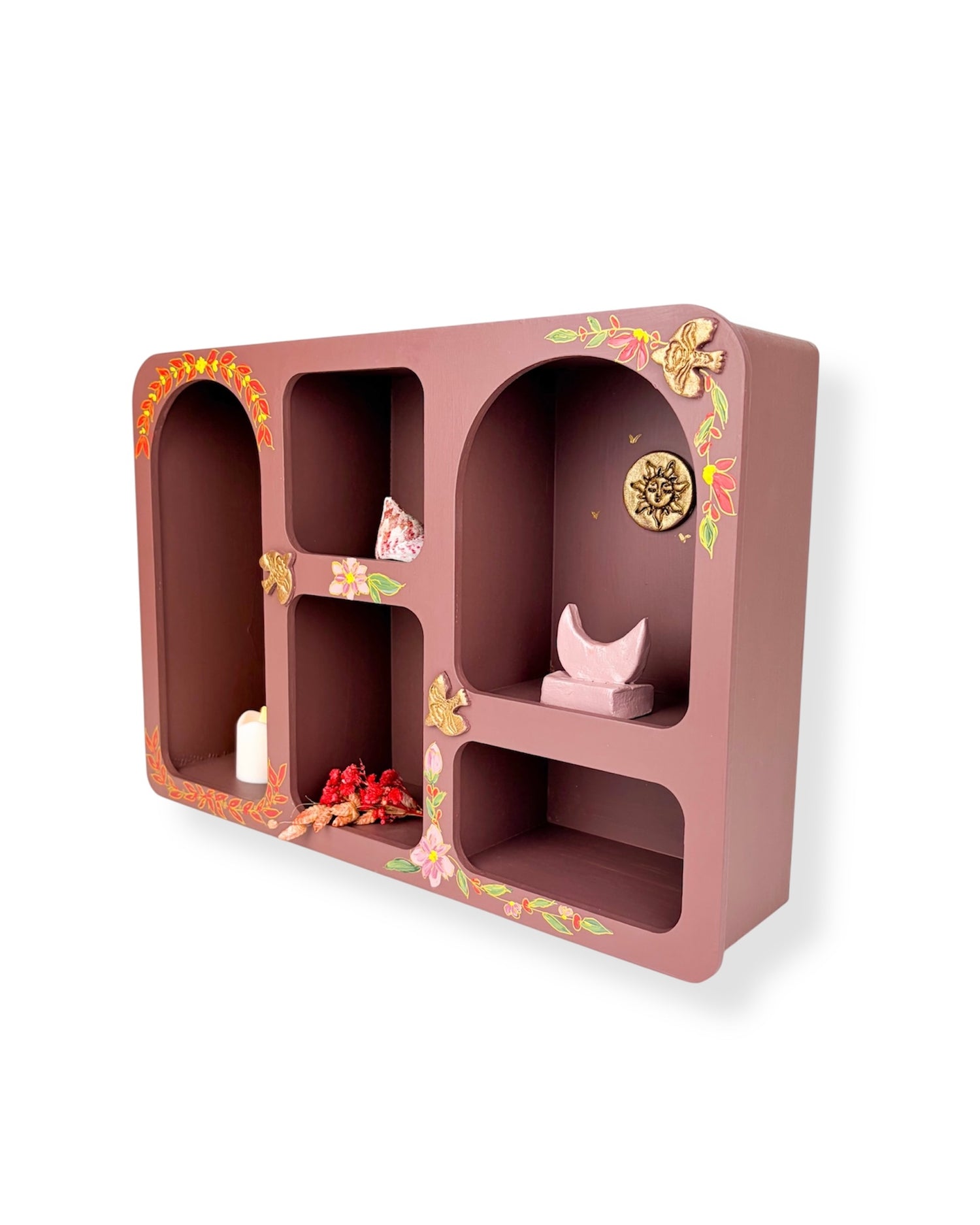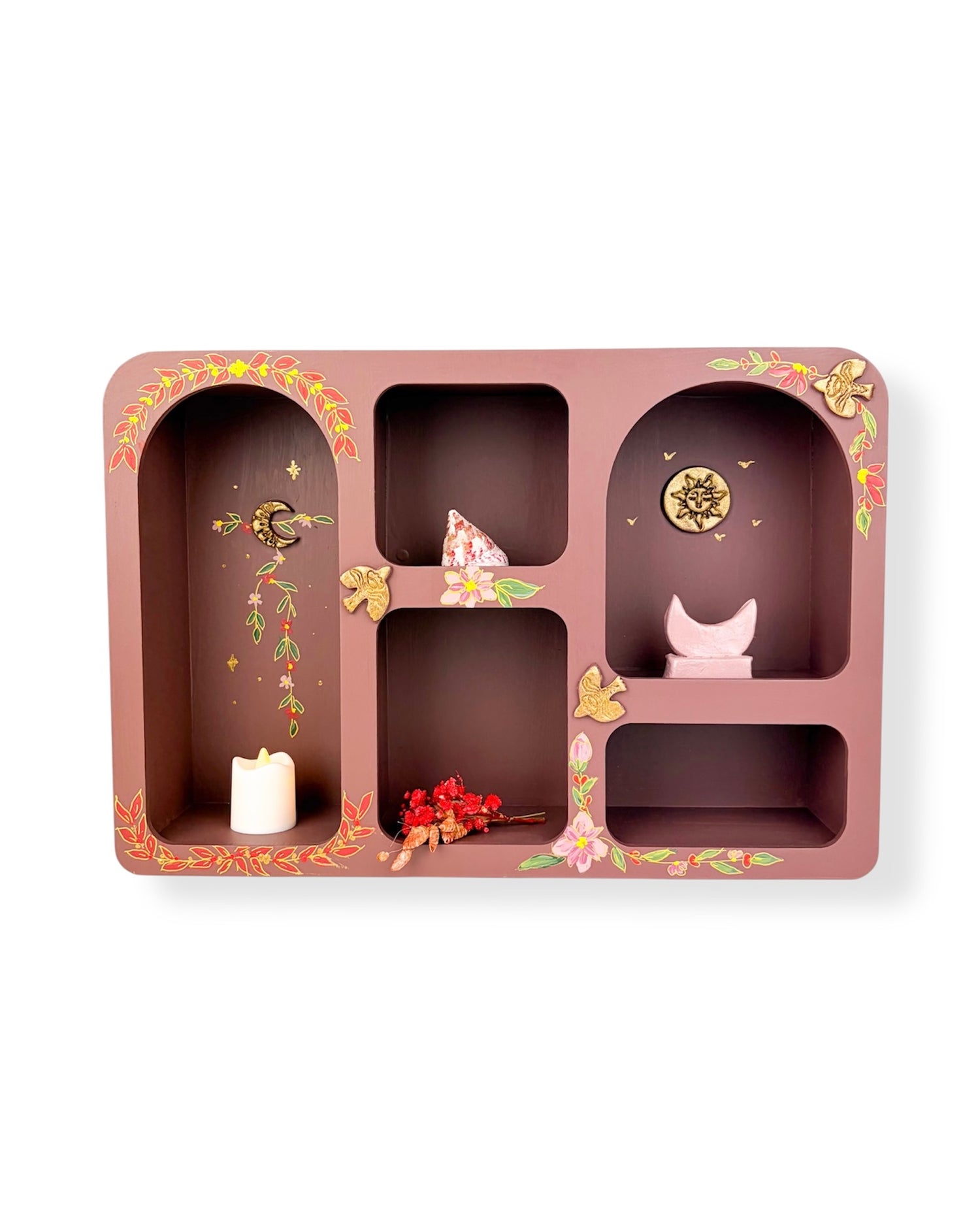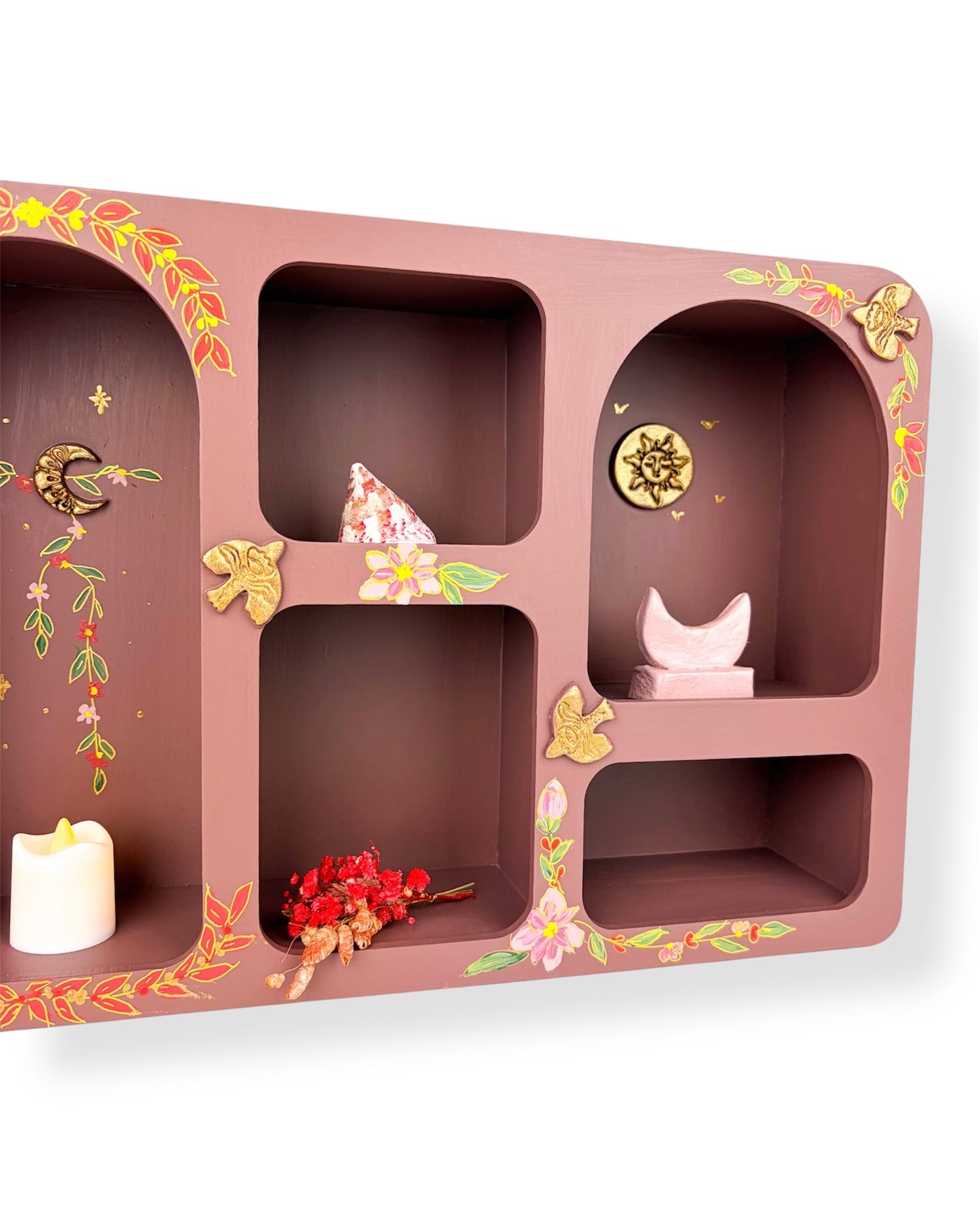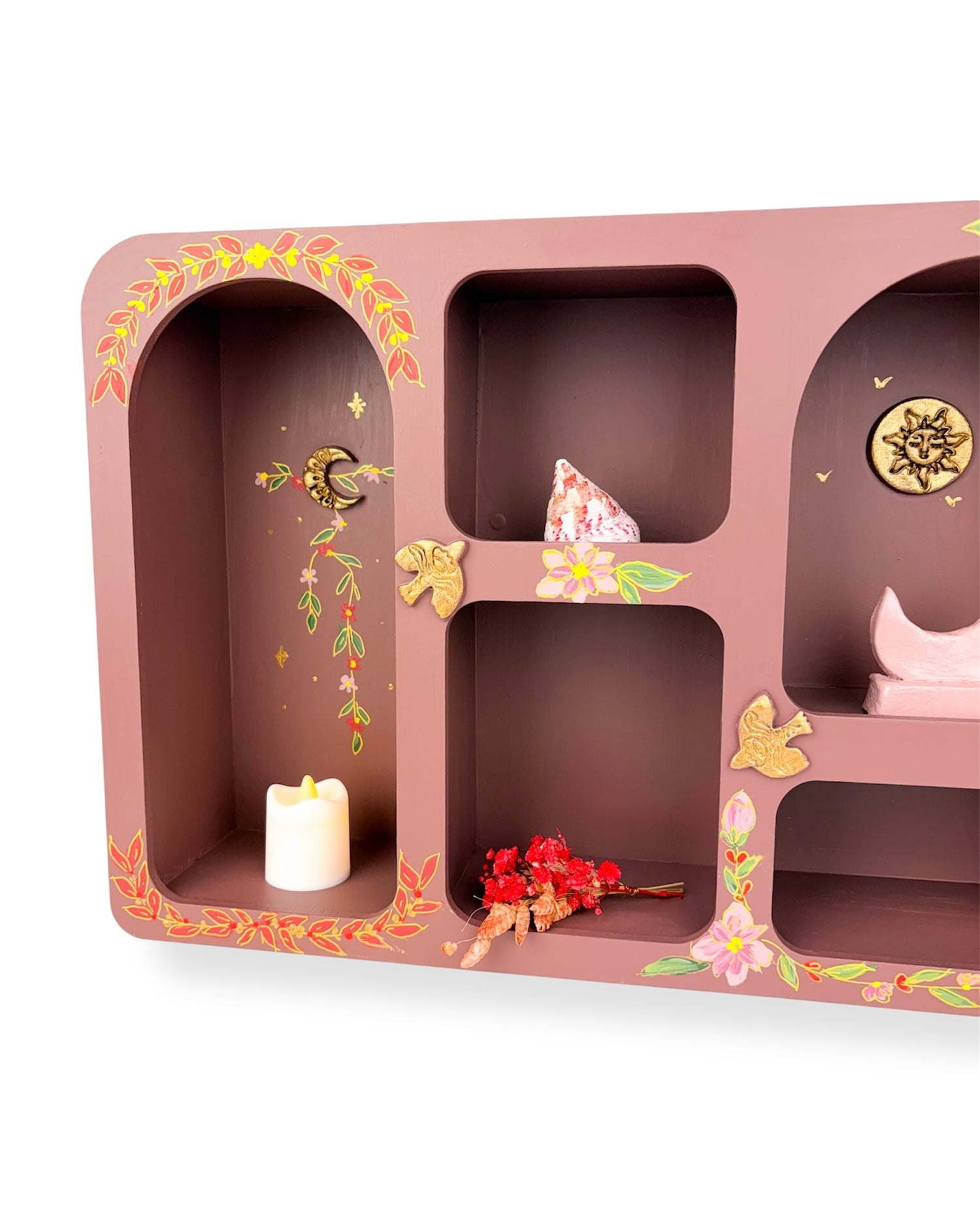Deze vakkenkast is een kunstwerk voor aan de muur of om neer te zetten. Hij is gemaakt van hout en versierd met paarse, gouden en roze schilderingen. Geef de vakkenkast een mooi plekje in huis en versier het met kleine decoratie.