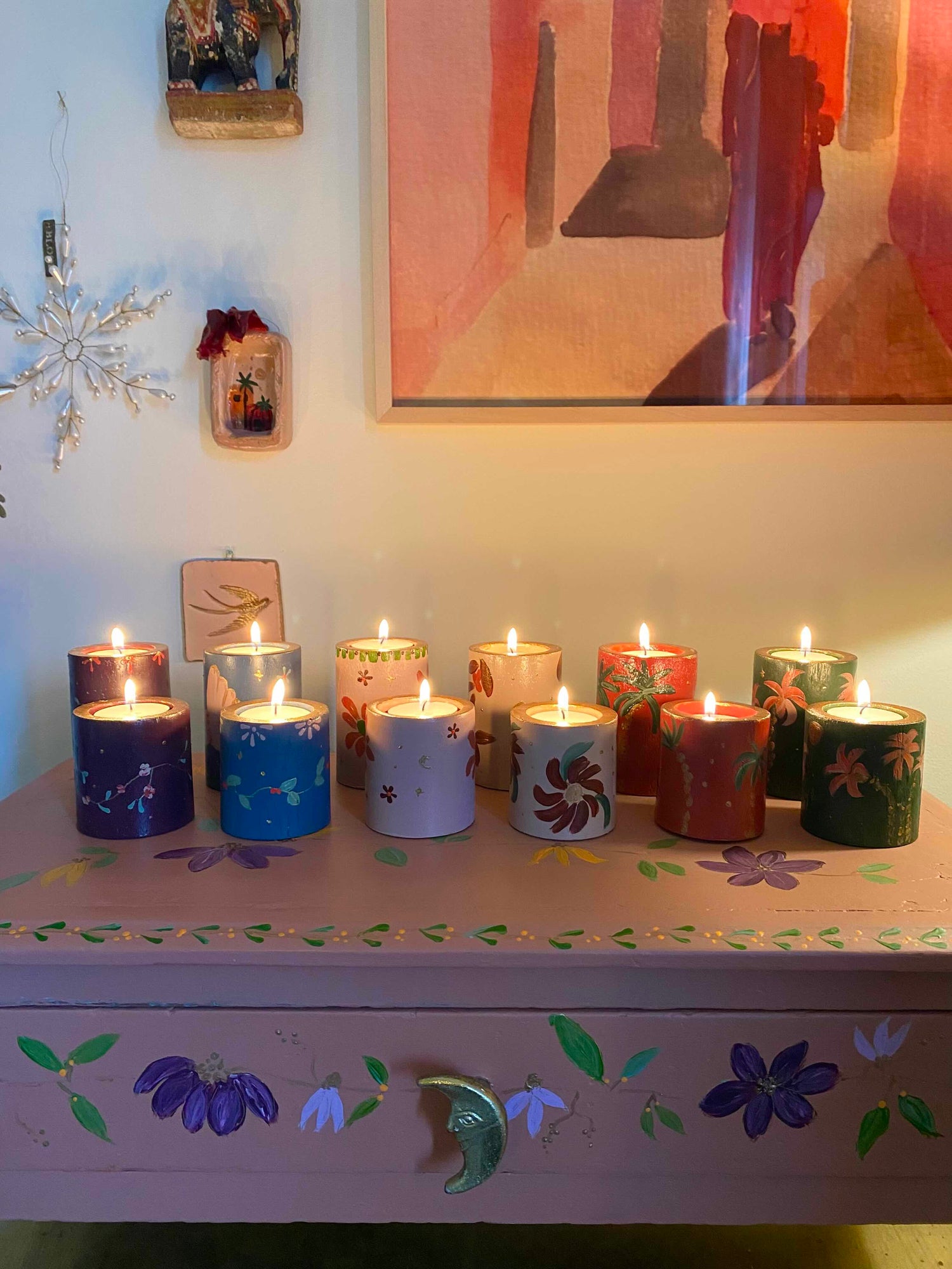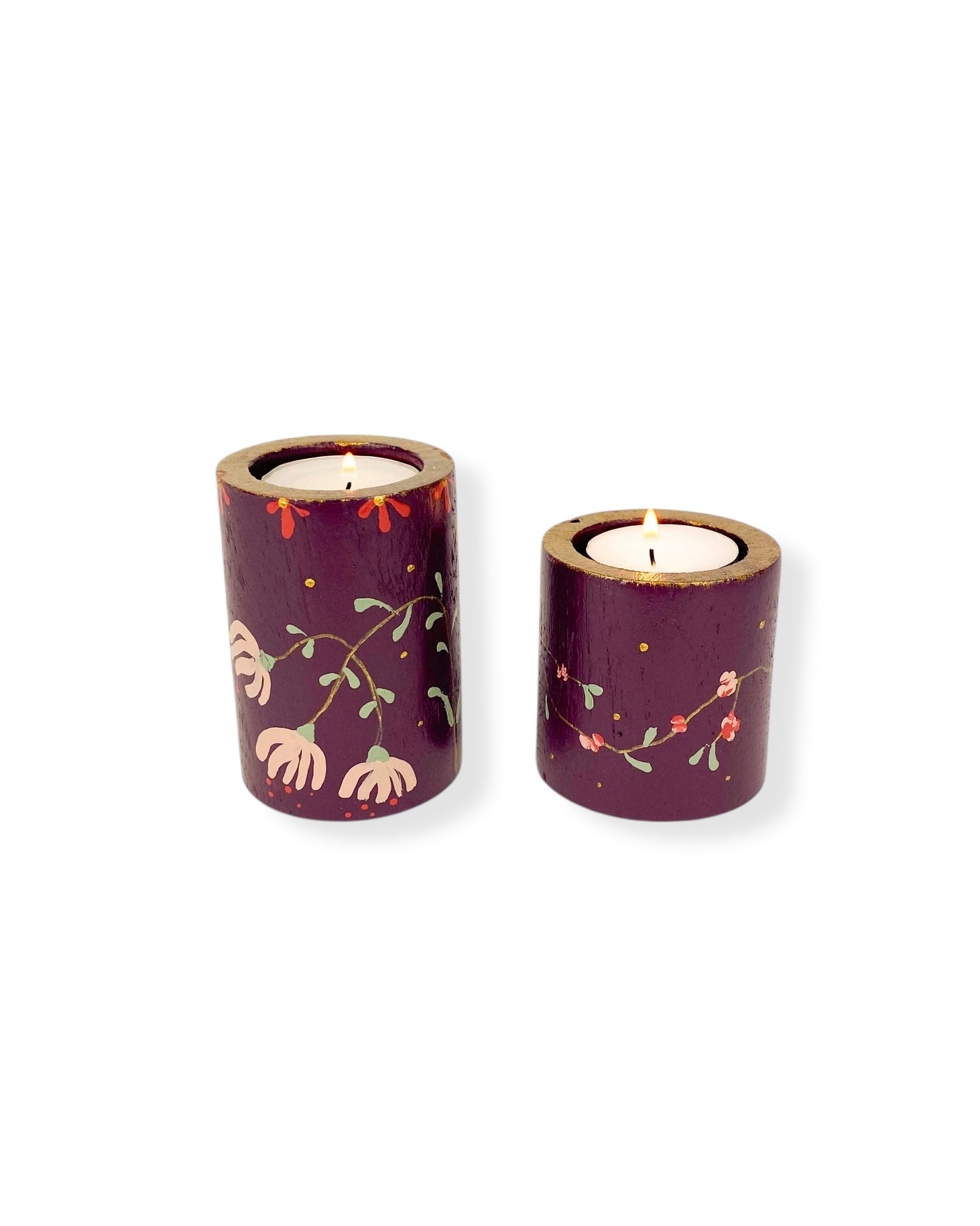 Deze set waxinelichthouders is een kunstwerk op zichzelf. Ze zijn gemaakt van hout en handbeschilderd door shopeigenaresse Irma in ons atelier in Haps. De waxinelichthouders zijn versierd met donkerpaarse schilderingen en bloemen.