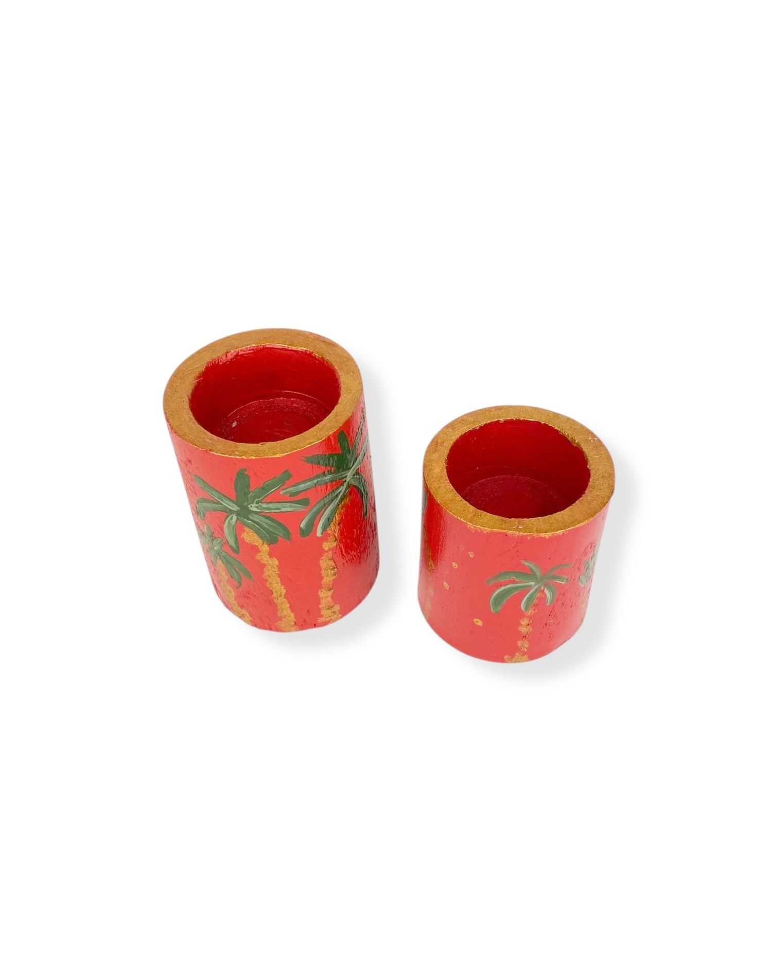 Deze set waxinelichthouders is een kunstwerk op zichzelf. Ze zijn gemaakt van hout en handbeschilderd door shopeigenaresse Irma in ons atelier in Haps. De waxinelichthouders zijn versierd met rode schilderingen en palmbomen.