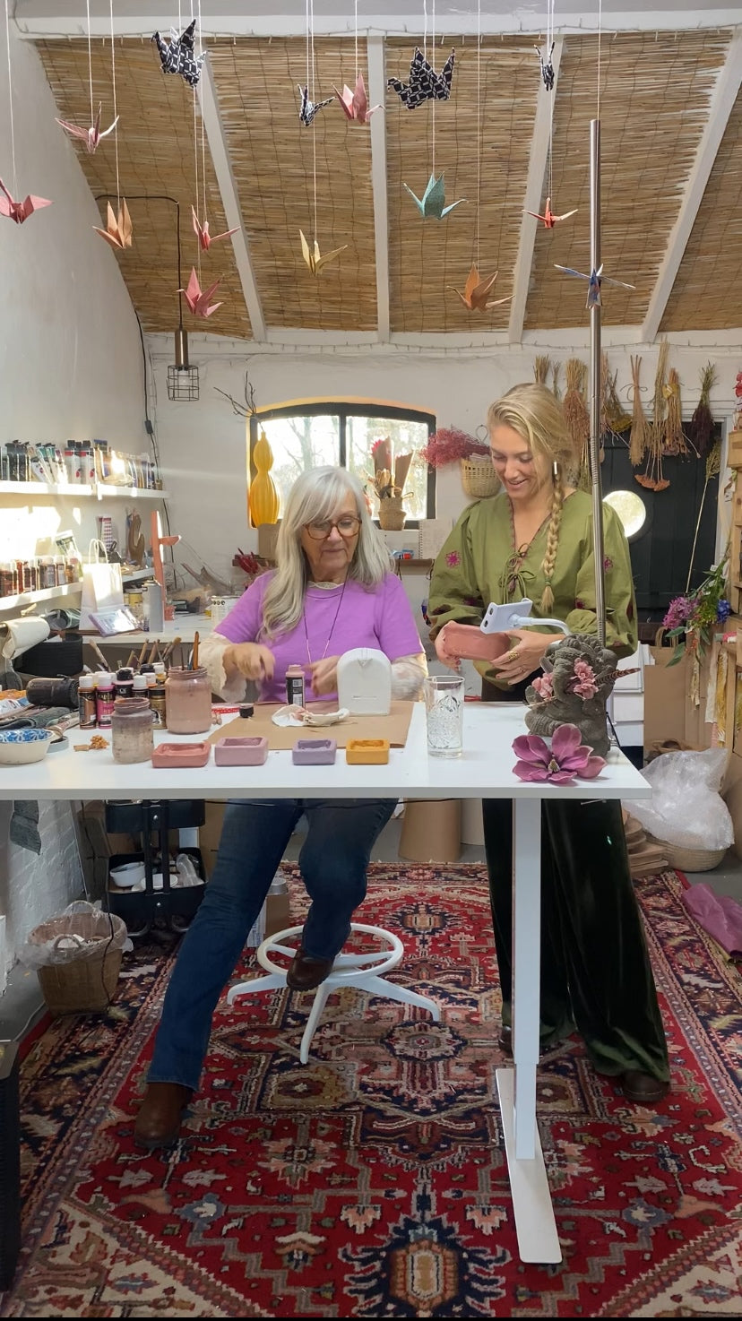Irma is het creatieve brein achter de ontwerpen. Het liefst spendeert ze al haar tijd in haar atelier waar ze elke keer weer nieuwe ideeën ontwikkelt en unieke, handgemaakte items maakt. Een voorbeeld hiervan zijn de handgemaakte altaren, gemaakt van klei en met de hand beschilderd.