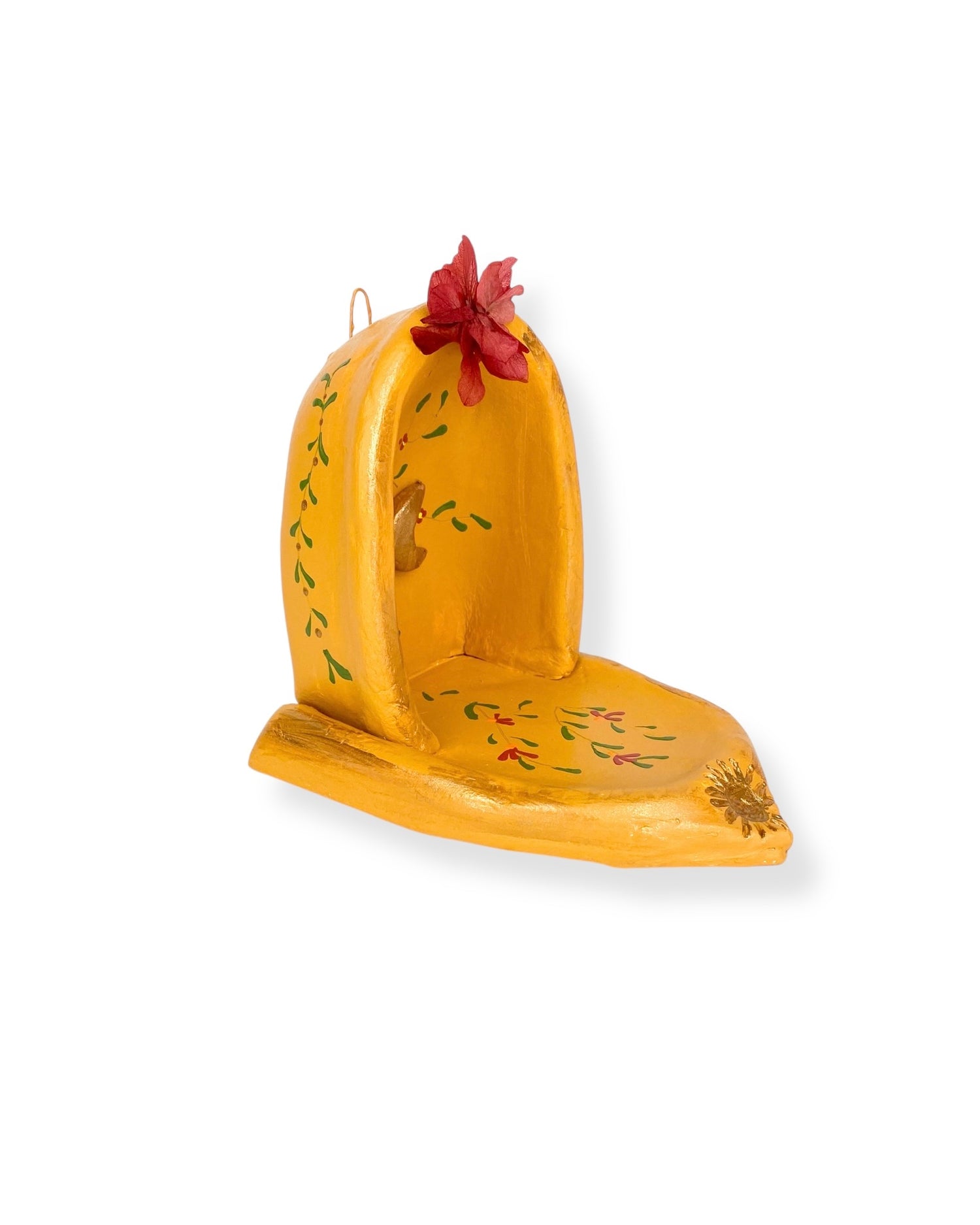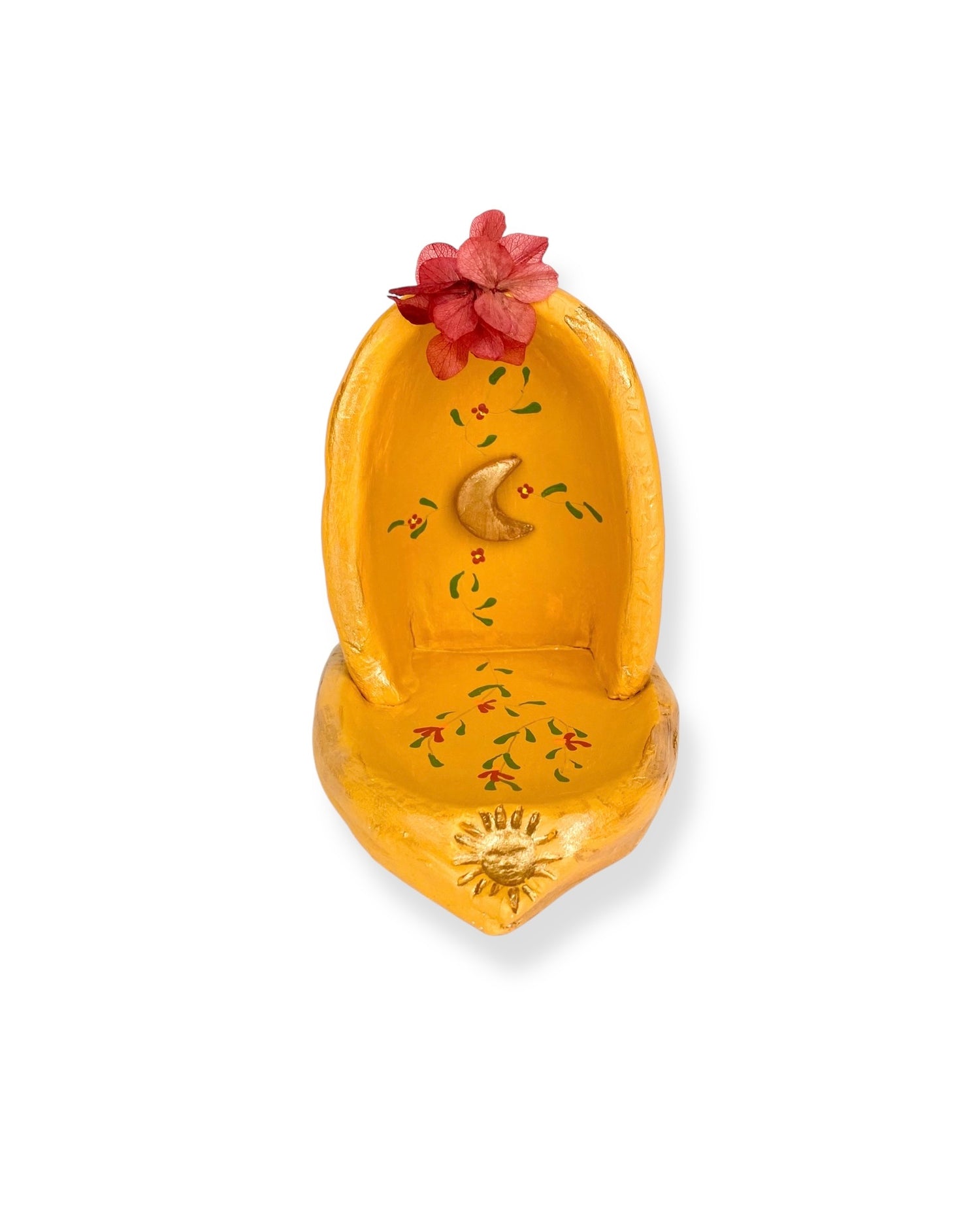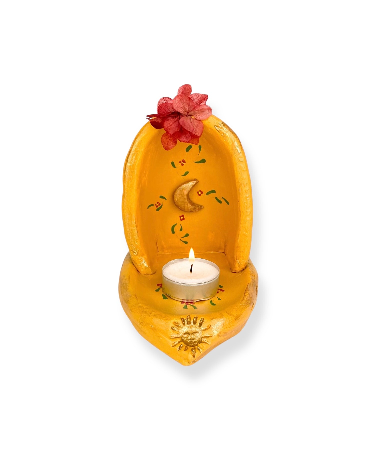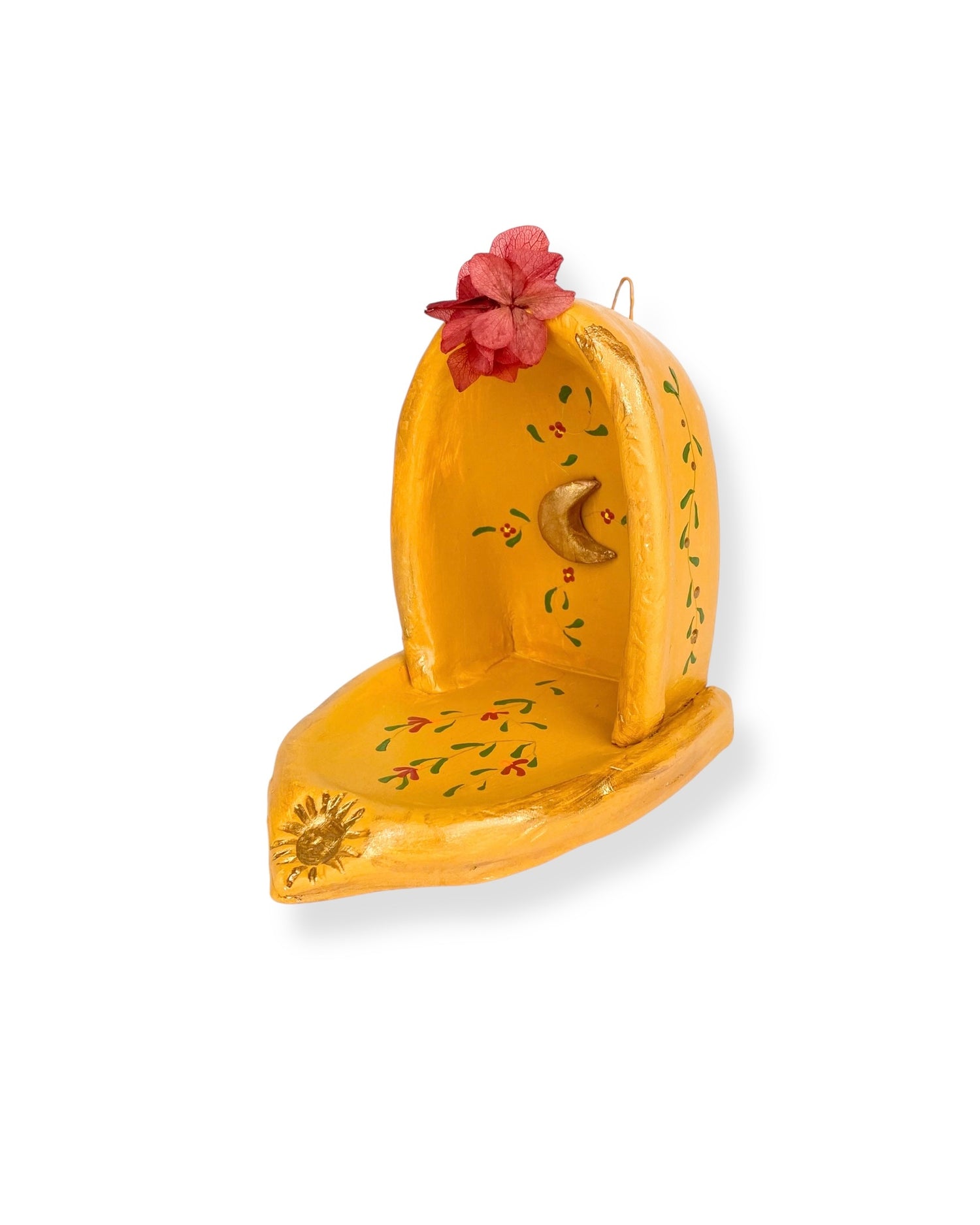 Dit altaar is een kunstwerk voor aan de muur. Het is volledig met de hand gemaakt van klei, door shopeigenaresse Irma in ons atelier in Haps. Het altaar is versierd met okergele schilderingen, bloemen en een gouden maan. Het heeft een haakje waarmee je het kan ophangen aan de muur. Creëer een eigen plekje in huis voor bezinning met een huisaltaar of geef het een mooi plekje aan de muur en combineer het met andere handgemaakte wanddecoratie zoals een wandtegeltje, wandbord of mini nisje.