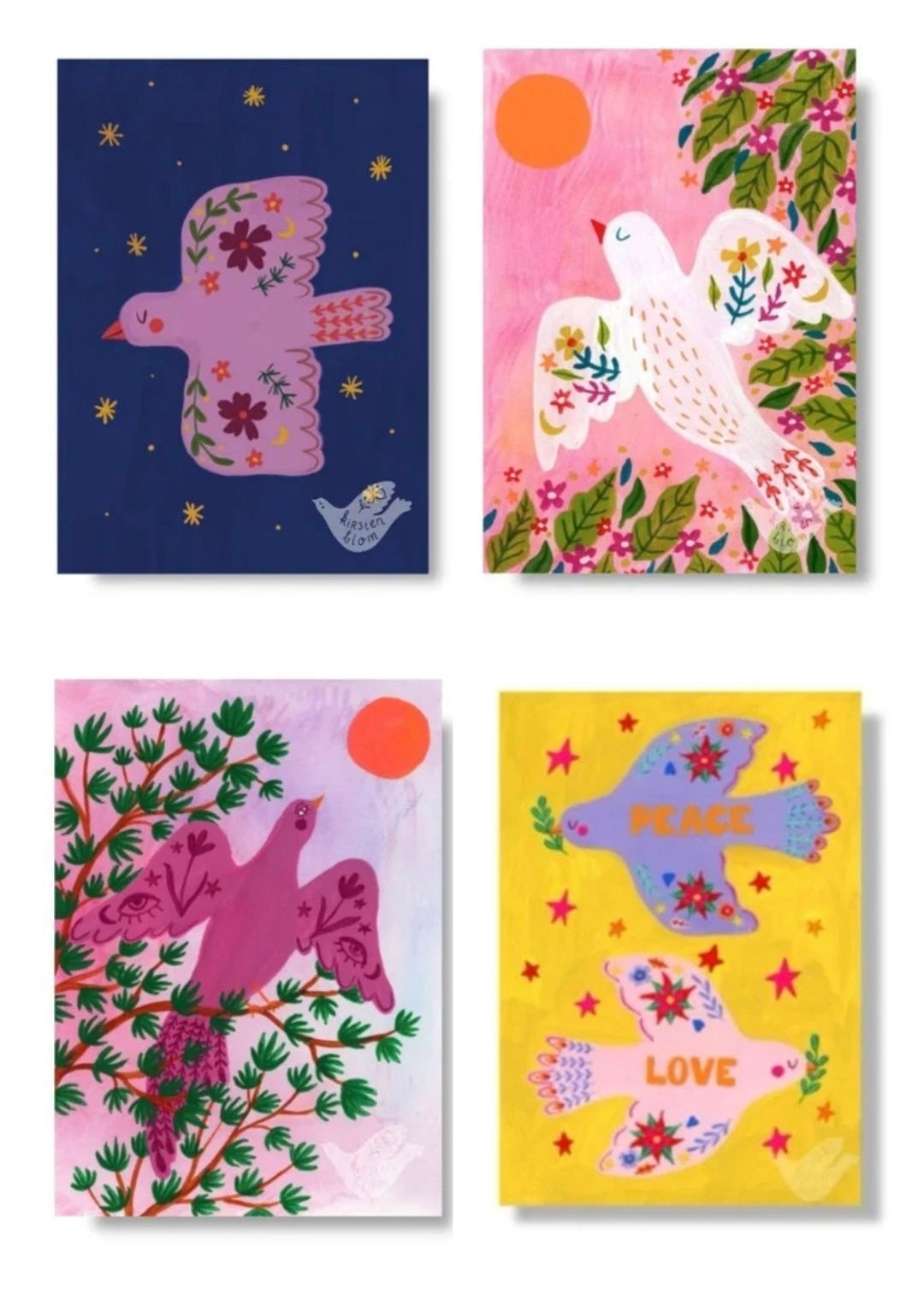 Deze vrolijke en kleurrijke ansichtkaarten zijn gemaakt door de Tilburgse kunstenares Kirsten Blom. In de set zitten 4 verschillende kaarten met vogels (zoals afgebeeld).