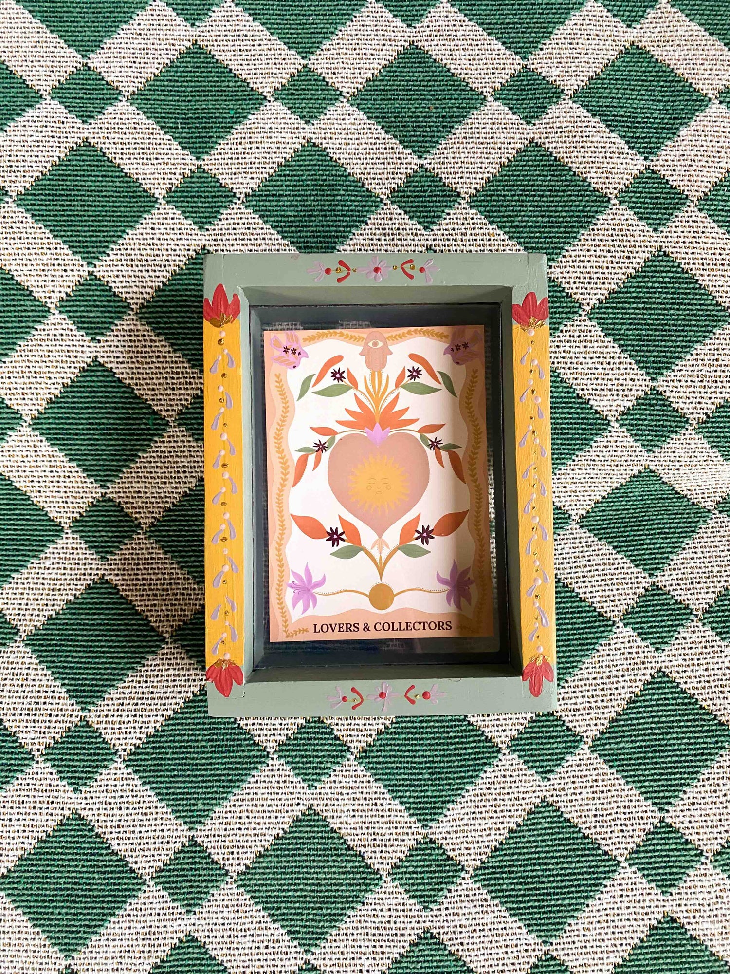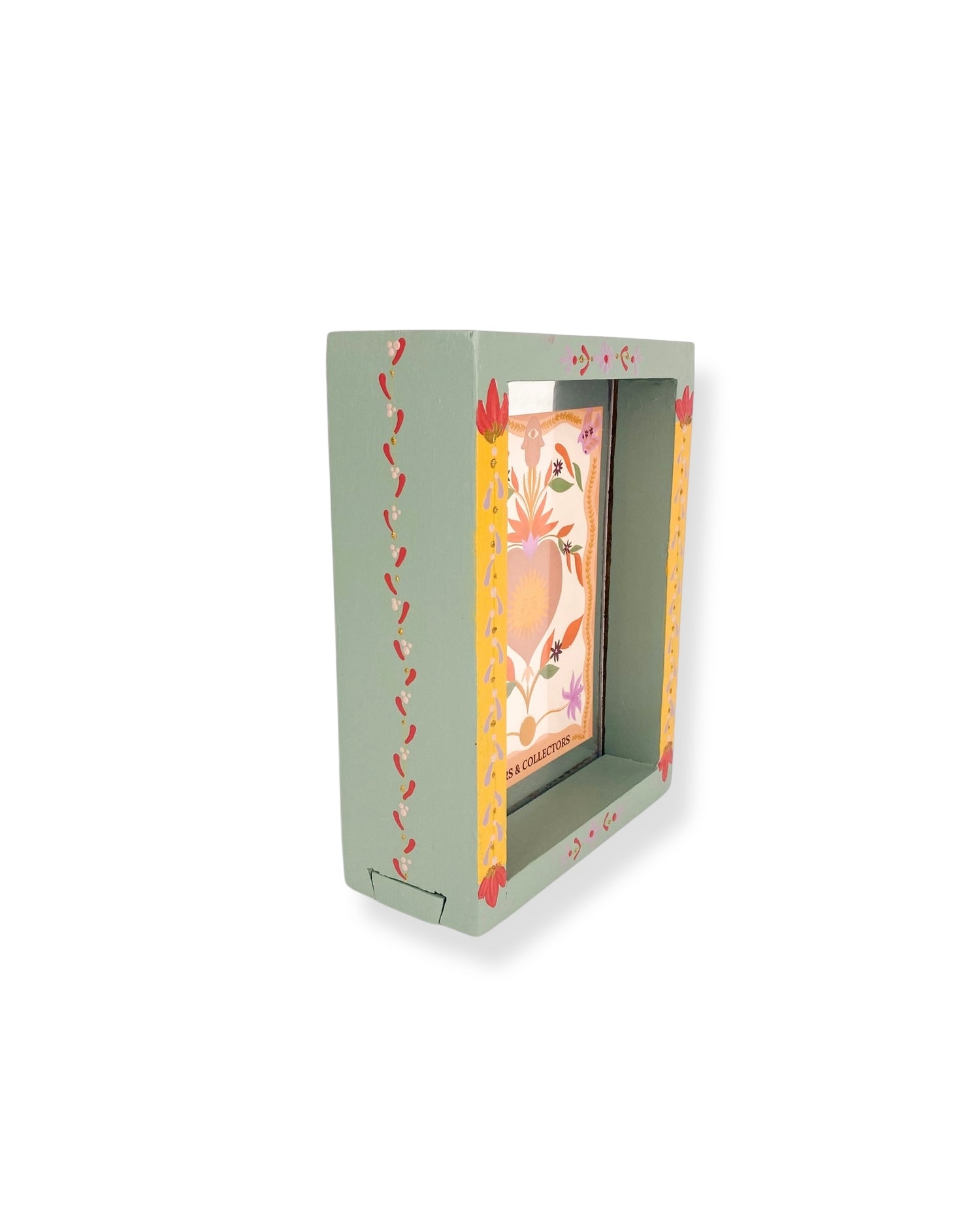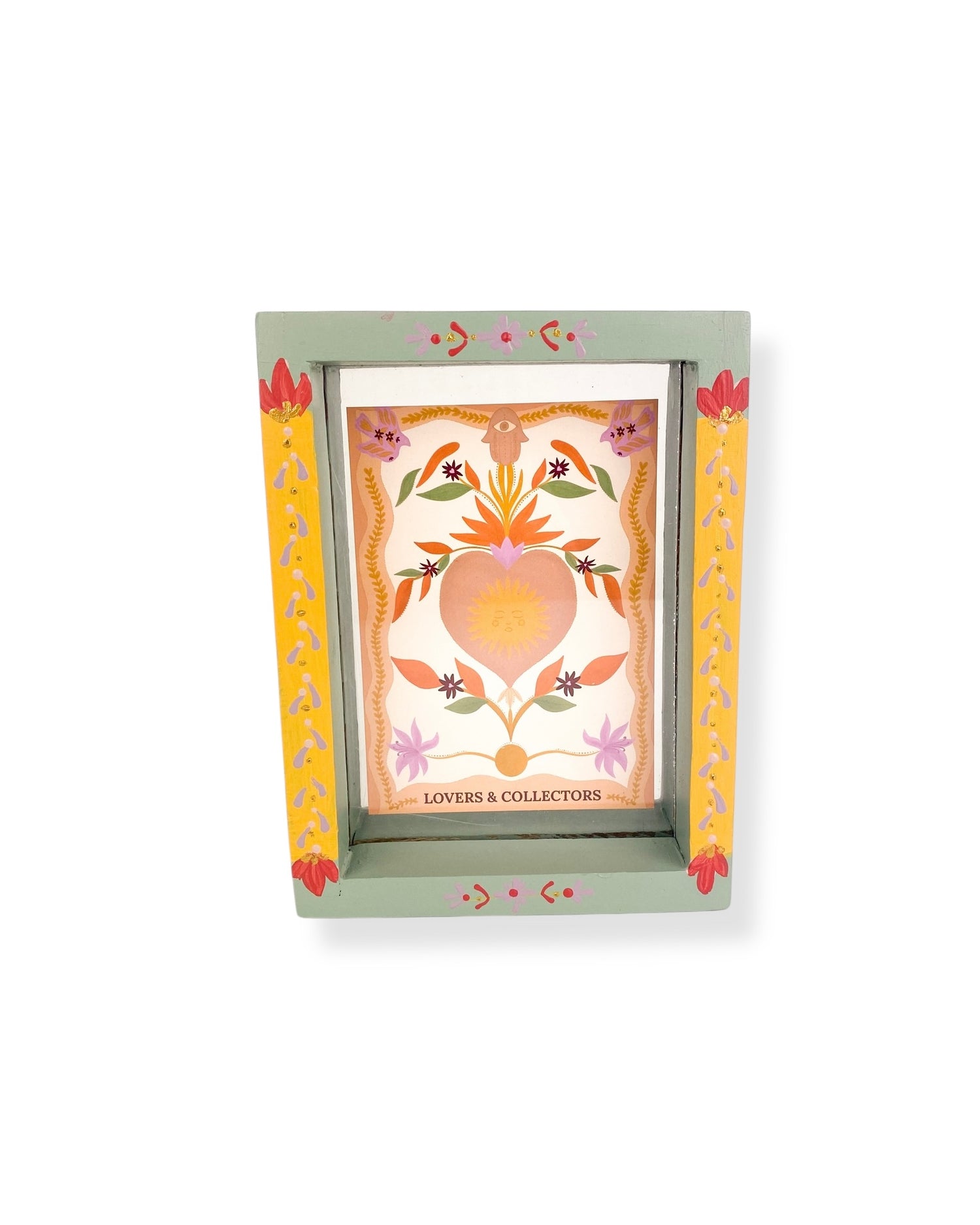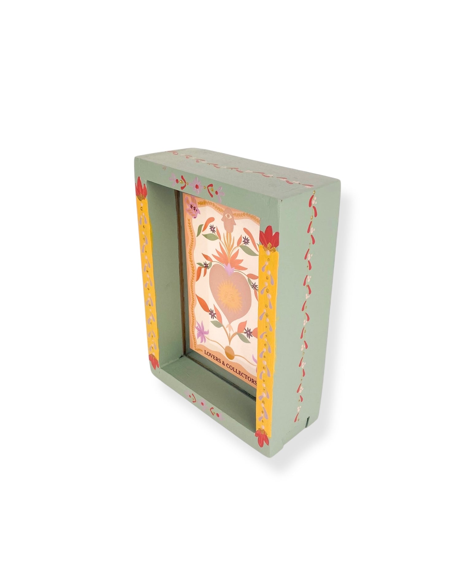 Deze fotolijst is een kunstwerk voor aan de muur of om neer te zetten. Hij is gemaakt van hout en versierd met pastel groene, okergele en rode schilderingen. Geef de fotolijst een mooi plekje in huis of combineer het met andere handgemaakte wanddecoratie, zoals een wandtegeltje, mini nisje of altaar.