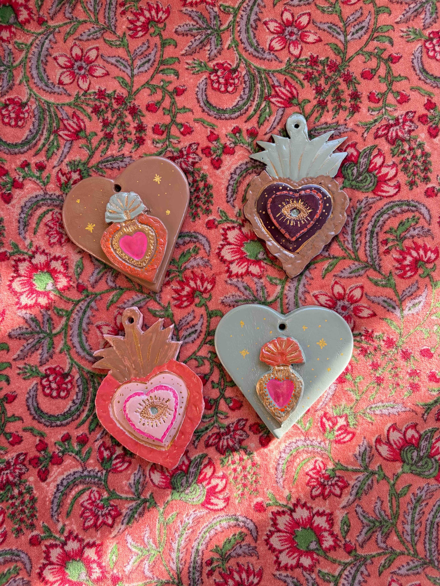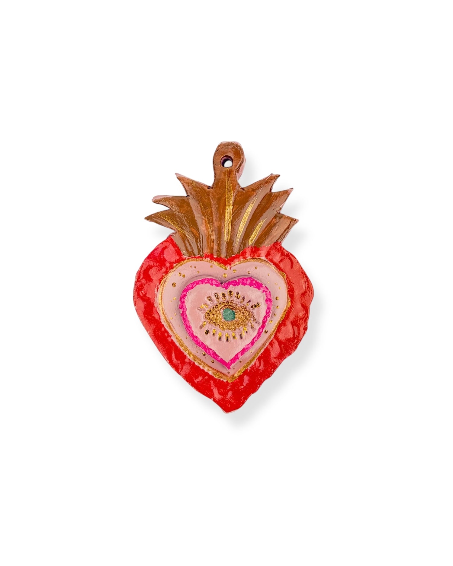 Dit Milagros hart is een klein kunstwerkje voor aan de muur. Het is volledig met de hand gemaakt van klei, door shopeigenaresse Irma in ons atelier in Haps. Het roze hart is versierd met gekleurde schilderingen en een derde oog. Geef het hart een mooi plekje in huis of combineer het met andere handgemaakte wanddecoratie, zoals een wandtegeltje, wandbord of altaar.