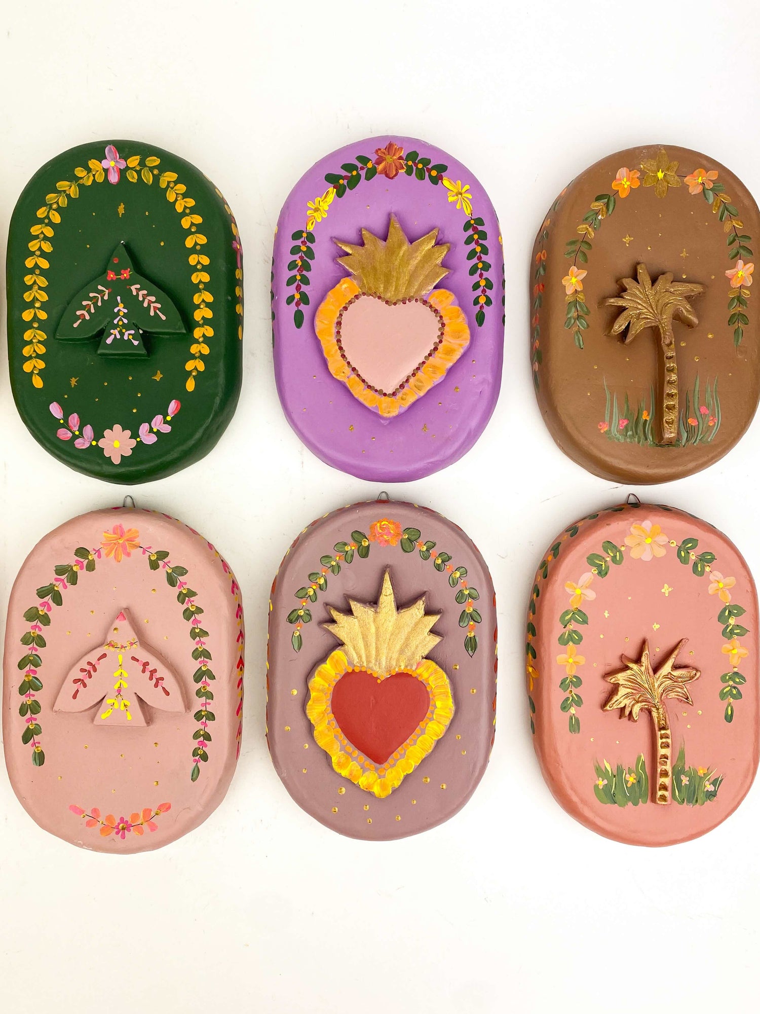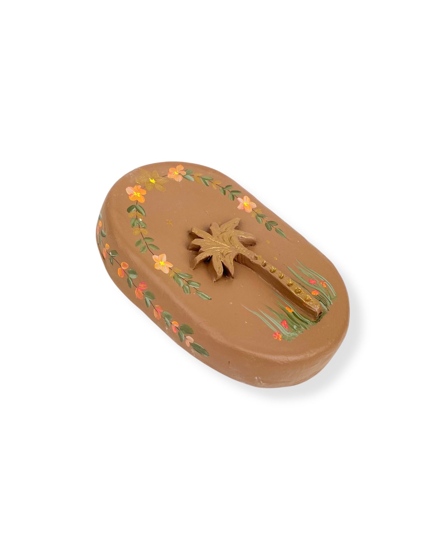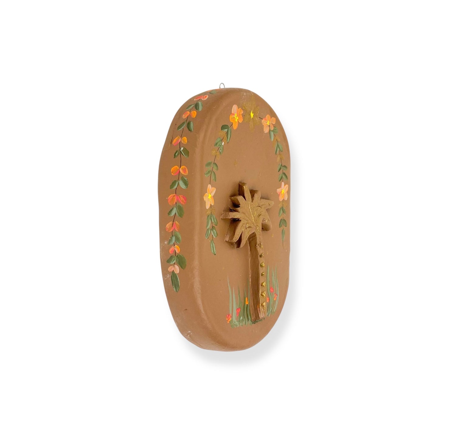 Deze muurhanger is een kunstwerk voor aan de muur. Het is volledig met de hand gemaakt van klei, door shopeigenaresse Irma in ons atelier in Haps. Het is versierd met bruine schilderingen, bloemen en een palmboom. Het heeft een haakje waarmee je het kan ophangen aan de muur. Geef de wandhanger een mooi plekje in huis of combineer het met andere handgemaakte wanddecoratie, zoals een wandtegeltje, wandbord of altaar.