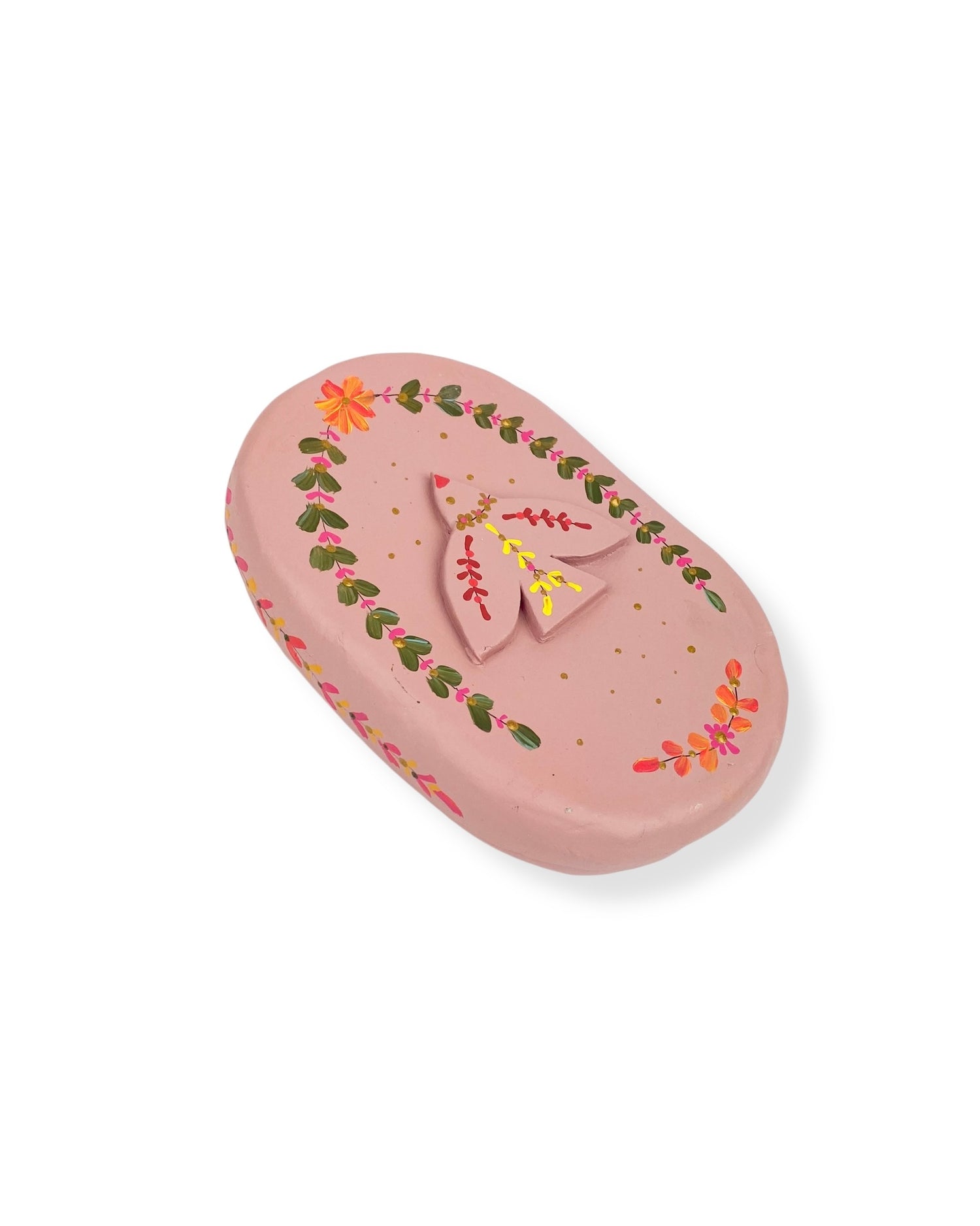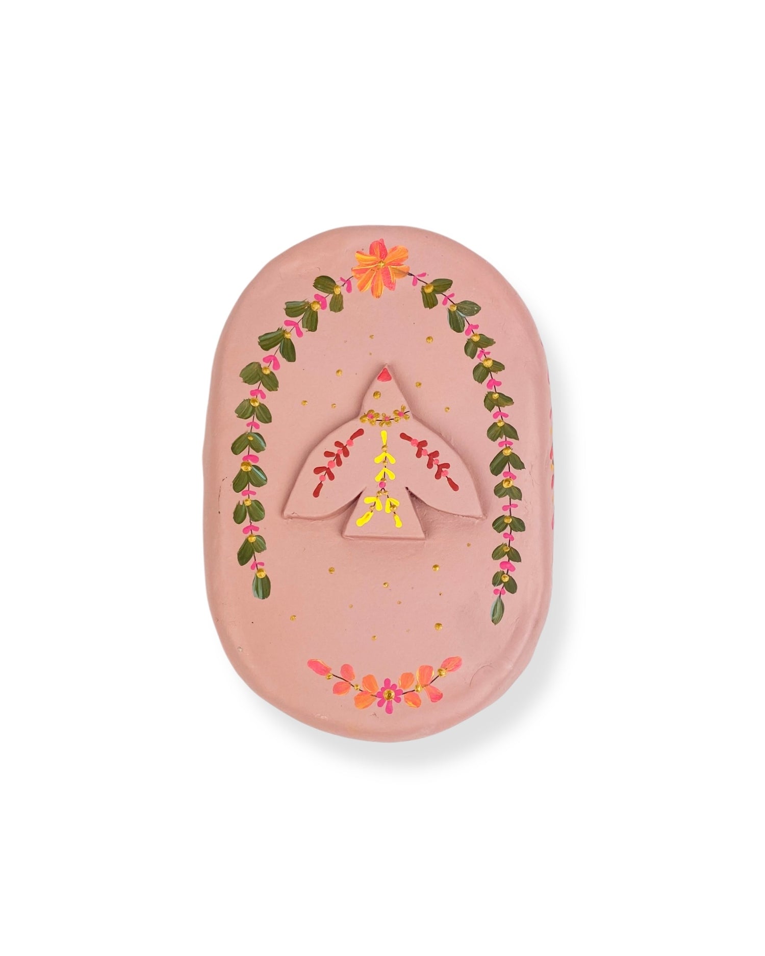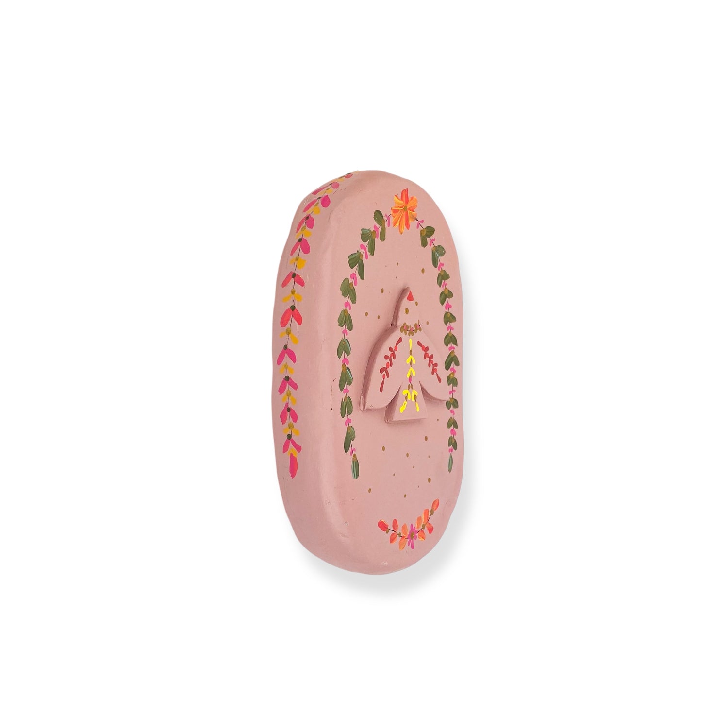 Deze muurhanger is een kunstwerk voor aan de muur. Het is volledig met de hand gemaakt van klei, door shopeigenaresse Irma in ons atelier in Haps. Het is versierd met roze schilderingen, bloemen en een zwaluw. Het heeft een haakje waarmee je het kan ophangen aan de muur. Geef de wandhanger een mooi plekje in huis of combineer het met andere handgemaakte wanddecoratie, zoals een wandtegeltje, wandbord of altaar.