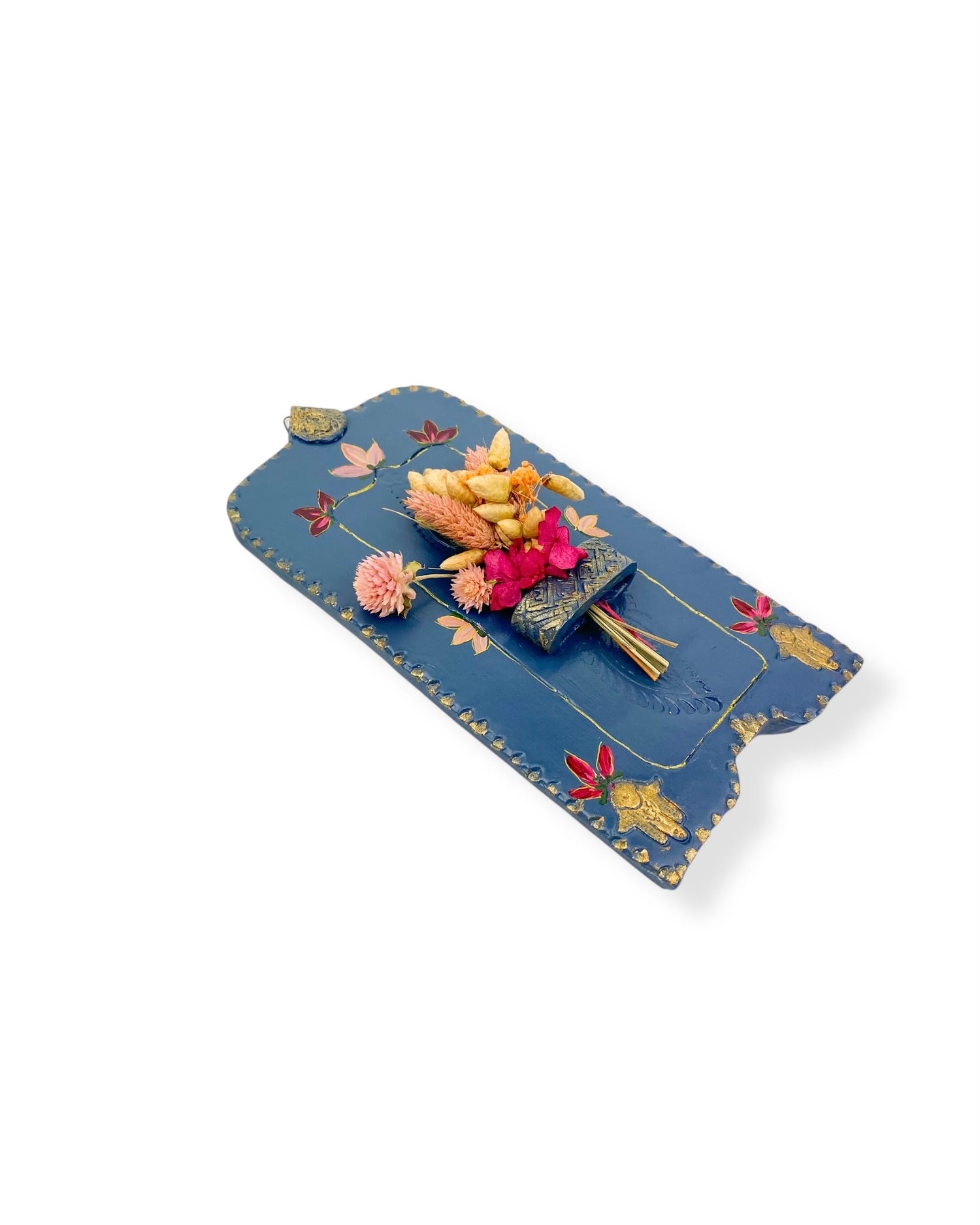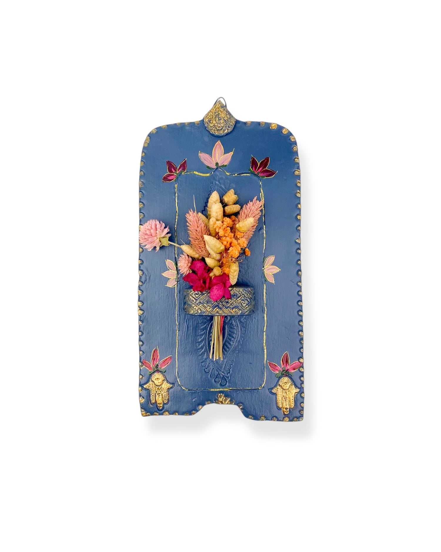 Dit muurvaasje is een kunstwerk voor aan de muur. Het is volledig met de hand gemaakt van klei, door shopeigenaresse Irma in ons atelier in Haps. Het is versierd met blauwe schilderingen en een bosje droogbloemen. Het heeft een haakje waarmee je het kan ophangen aan de muur. Geef het muurvaasje een mooi plekje in huis of combineer het met andere handgemaakte wanddecoratie, zoals een wandtegeltje, wandbord of altaar.