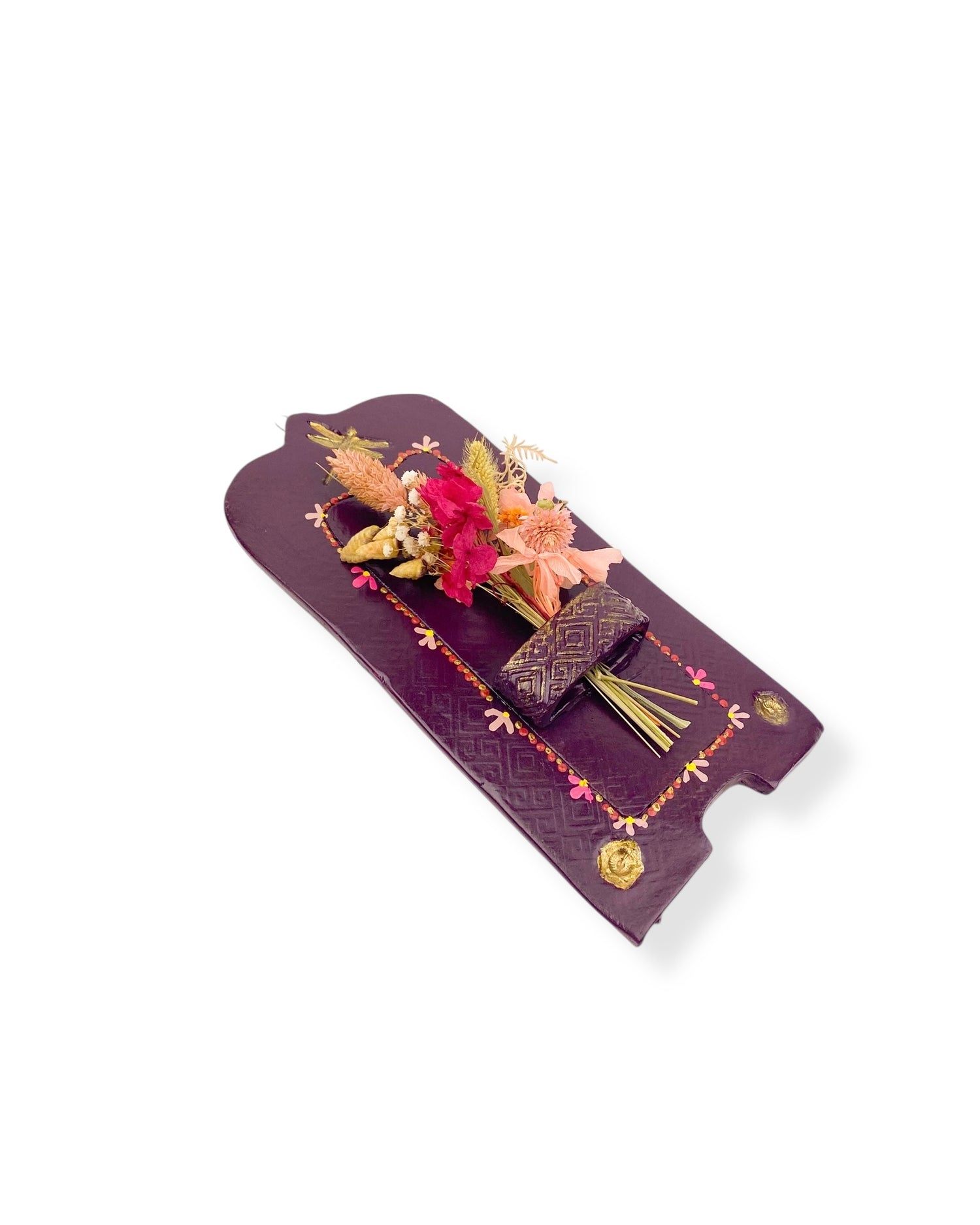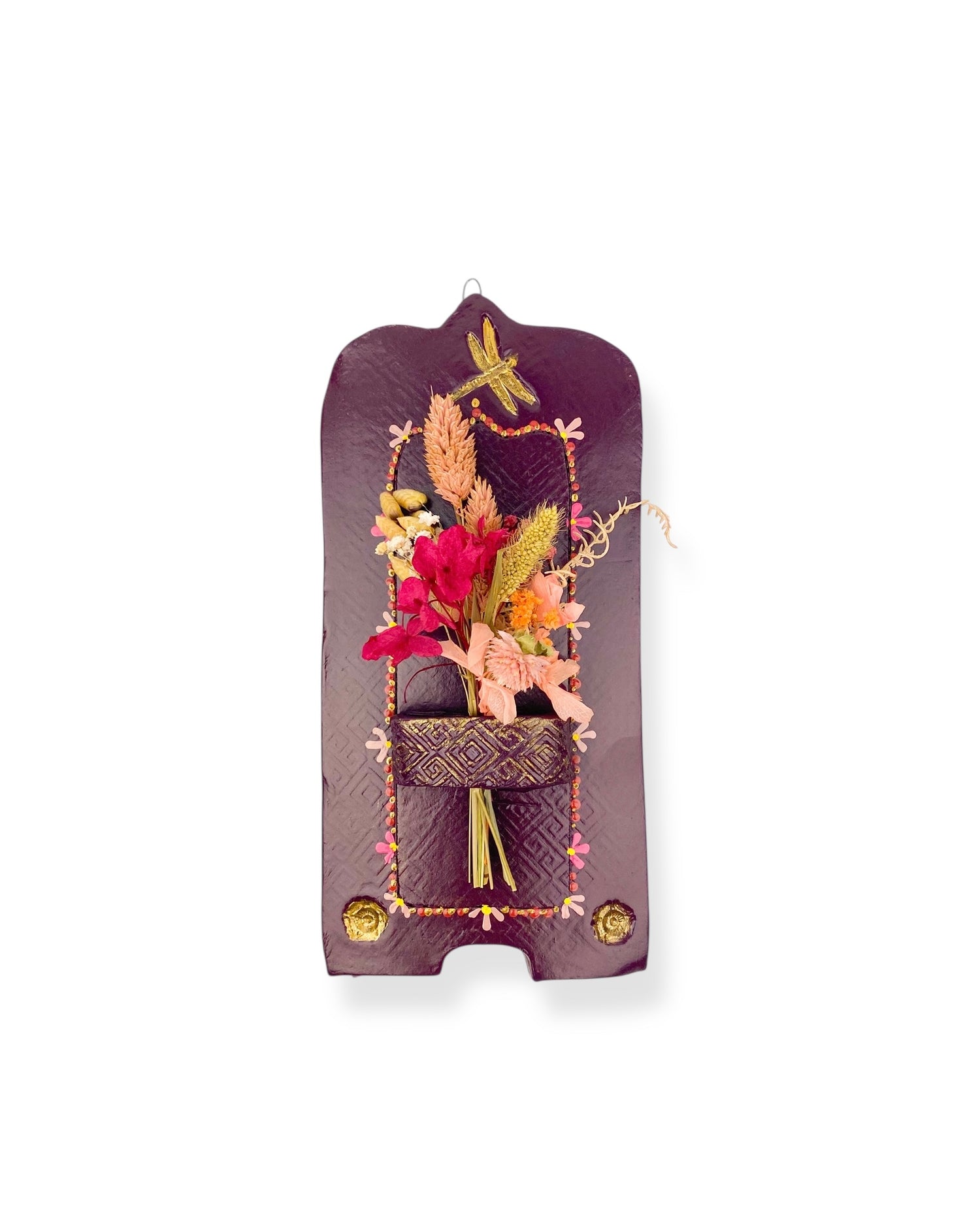 Dit muurvaasje is een kunstwerk voor aan de muur. Het is volledig met de hand gemaakt van klei, door shopeigenaresse Irma in ons atelier in Haps. Het is versierd met paarse schilderingen en een bosje droogbloemen. Het heeft een haakje waarmee je het kan ophangen aan de muur. Geef het muurvaasje een mooi plekje in huis of combineer het met andere handgemaakte wanddecoratie, zoals een wandtegeltje, wandbord of altaar.