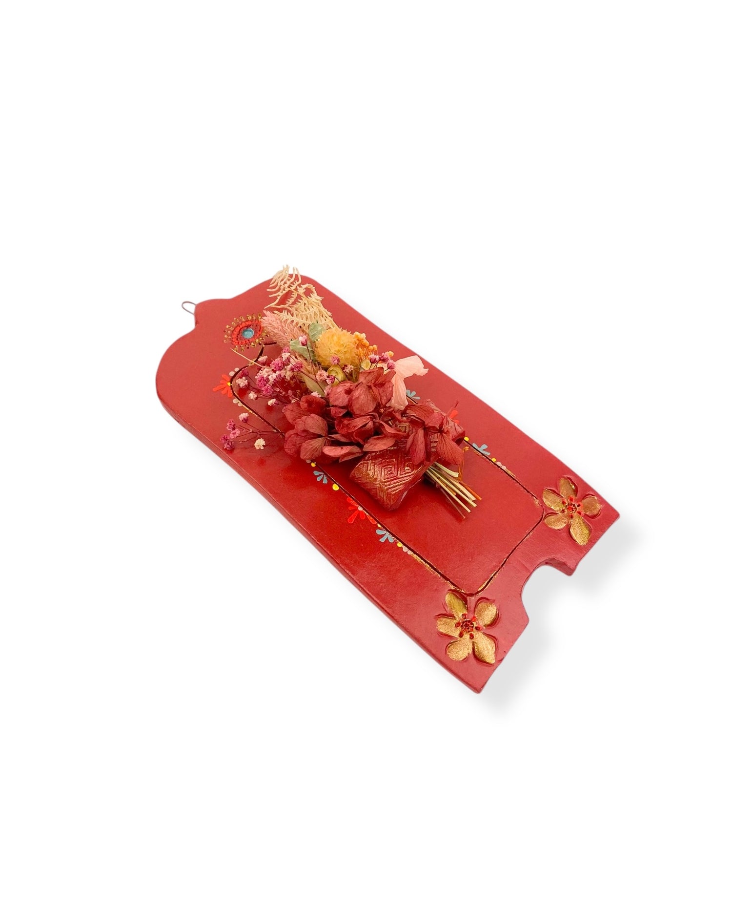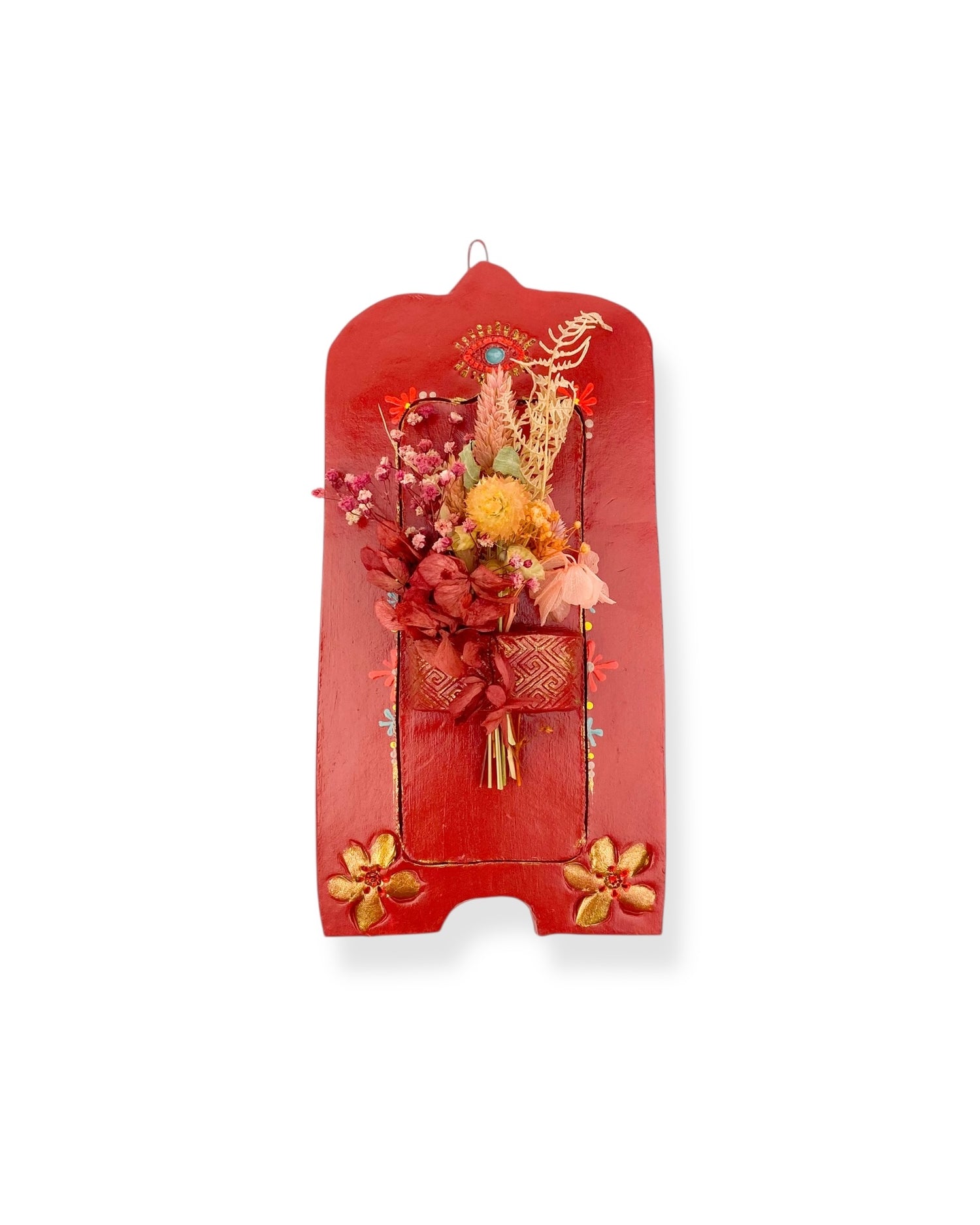 Dit muurvaasje is een kunstwerk voor aan de muur. Het is volledig met de hand gemaakt van klei, door shopeigenaresse Irma in ons atelier in Haps. Het is versierd met rode schilderingen en een bosje droogbloemen. Het heeft een haakje waarmee je het kan ophangen aan de muur. Geef het muurvaasje een mooi plekje in huis of combineer het met andere handgemaakte wanddecoratie, zoals een wandtegeltje, wandbord of altaar.