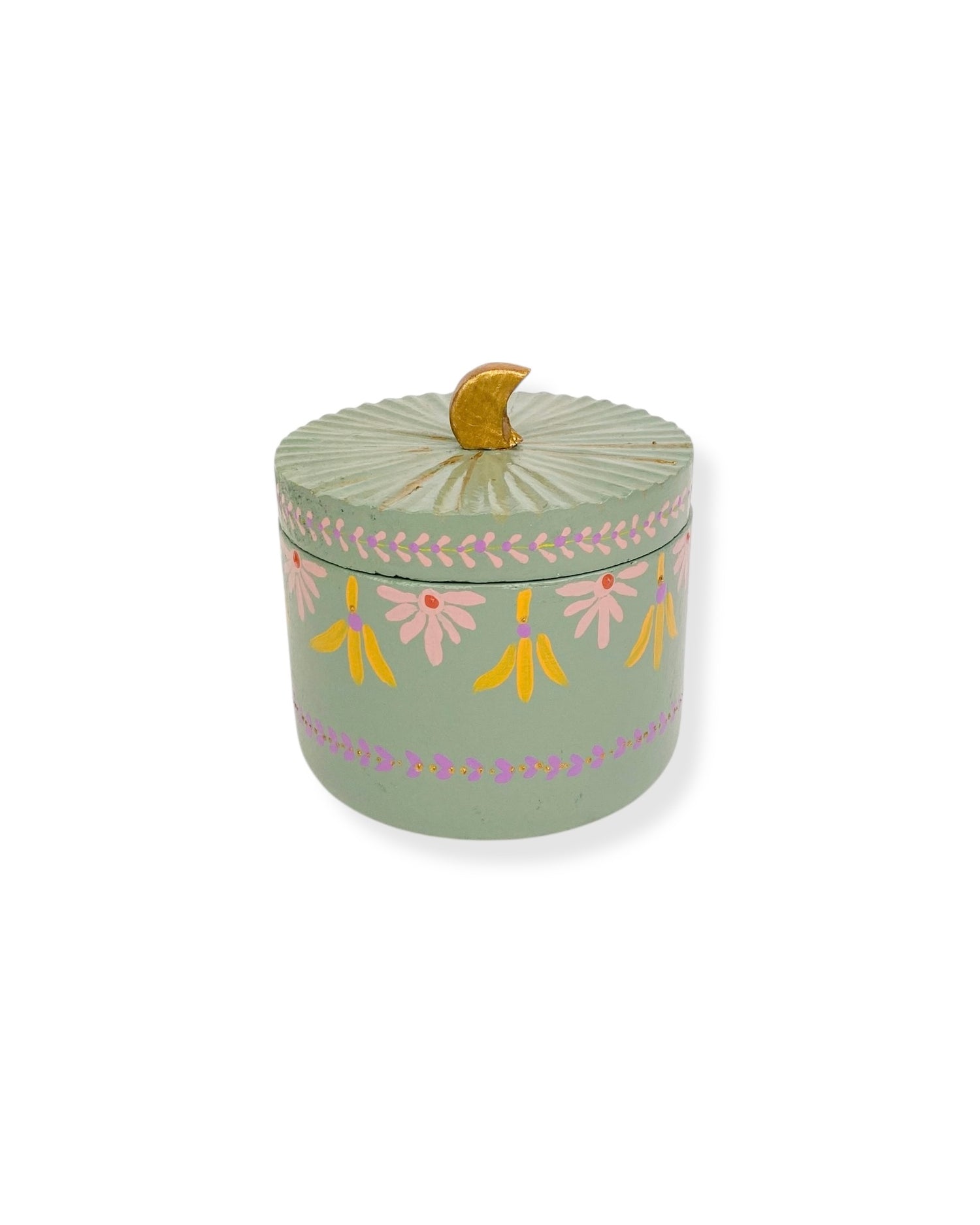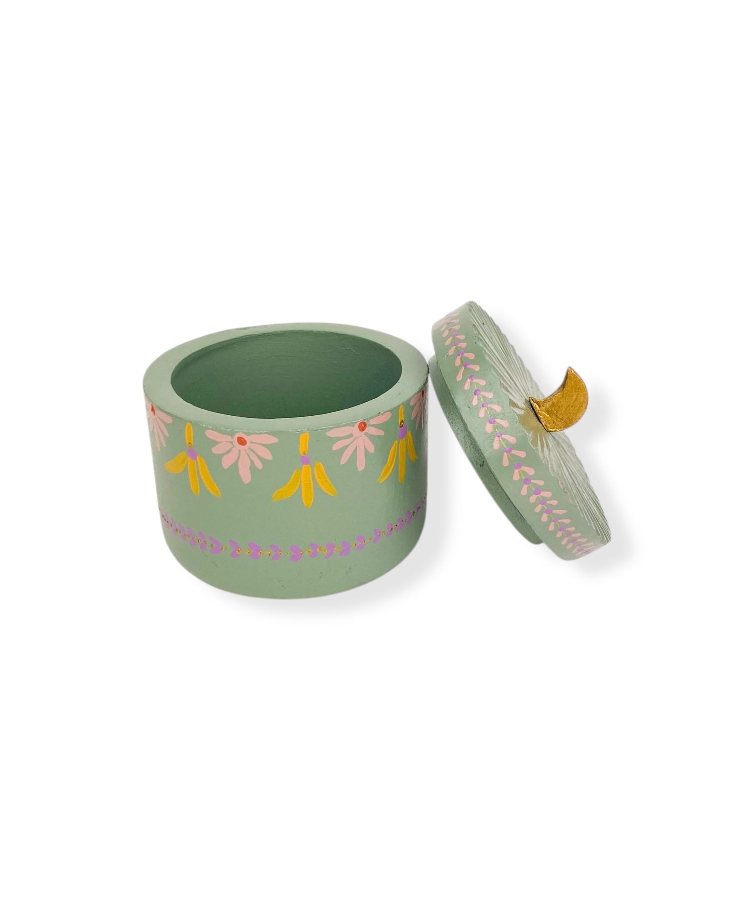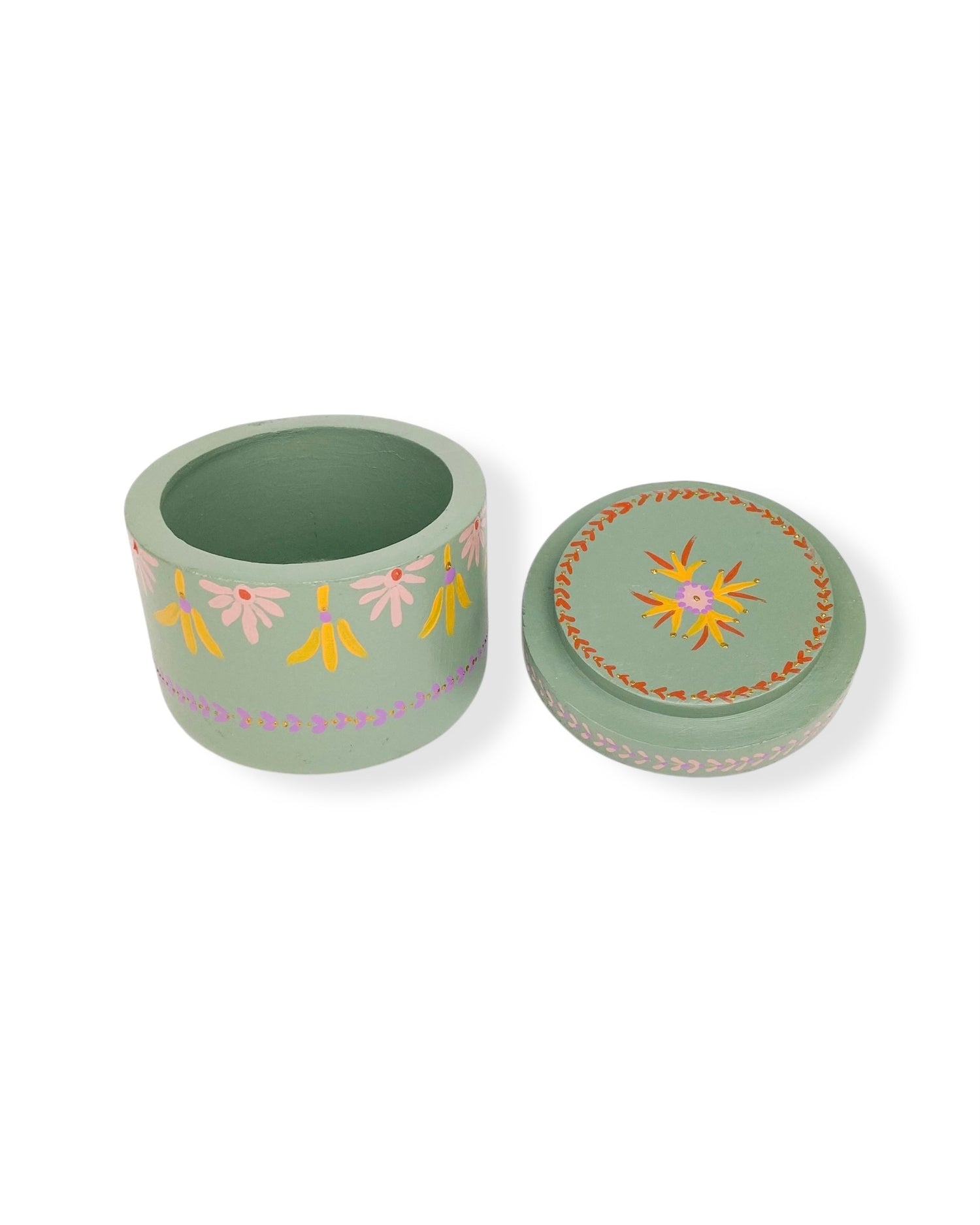 Dit houten sieradendoosje is een kunstwerkje om jouw waardevolle spulletjes in op te bergen, zoals jouw mooiste sieraden. Het doosje is handbeschilderd door shop eigenaresse Irma in ons atelier. Ieder ontwerp is uniek, op gevoel gemaakt en zowel aan de binnen- als buitenkant beschilderd.