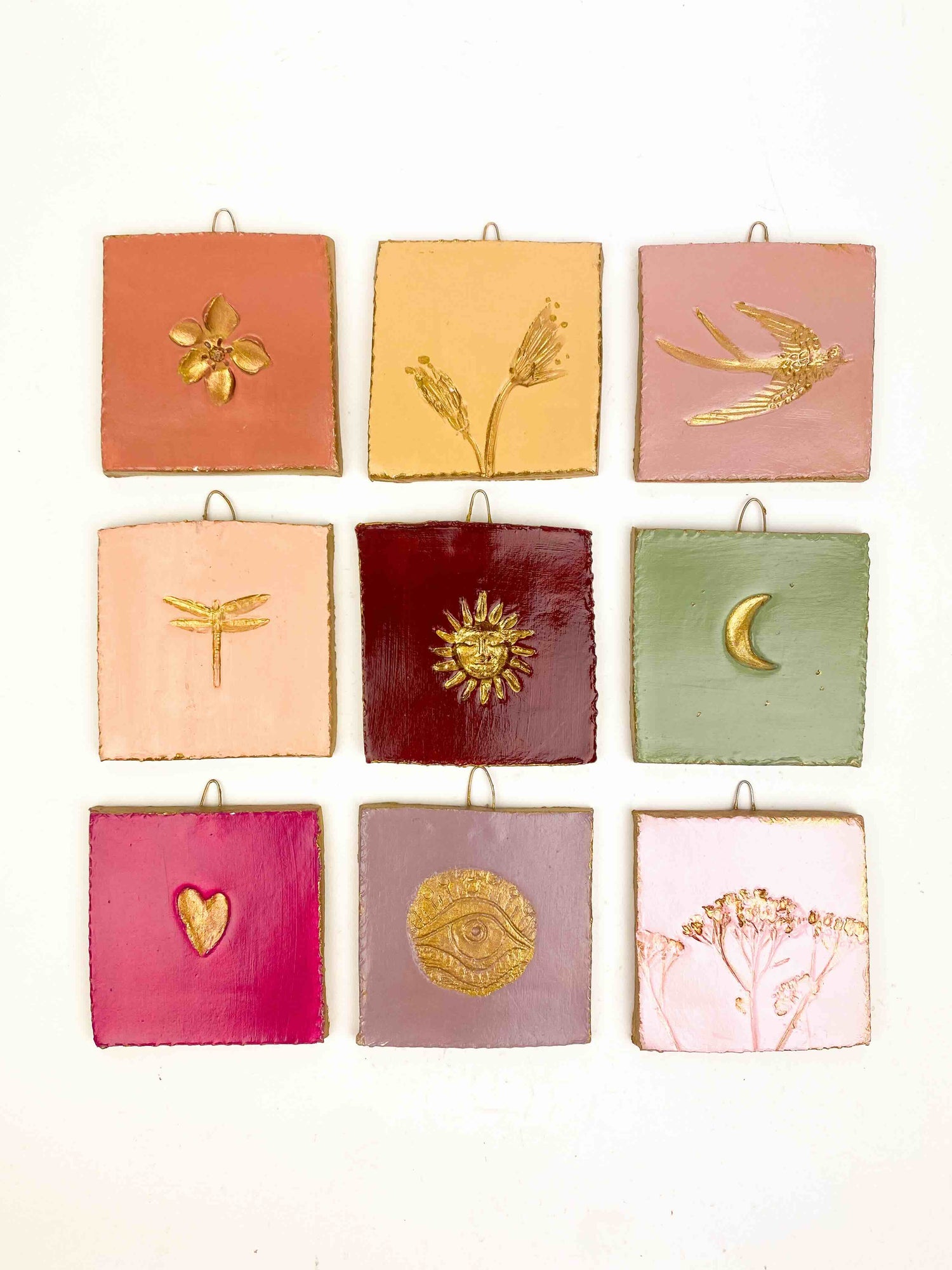 Dit tegeltje is een klein kunstwerkje voor aan de muur. Het is volledig met de hand gemaakt van klei, door shopeigenaresse Irma in ons atelier in Haps. Het tegeltje is versierd met roze schilderingen, een gouden zwaluw en een haakje waarmee je het kan ophangen aan de muur. Geef het tegeltje een mooi plekje in huis of combineer het met andere handgemaakte wanddecoratie, zoals een mini nisje, wandbord of altaar.