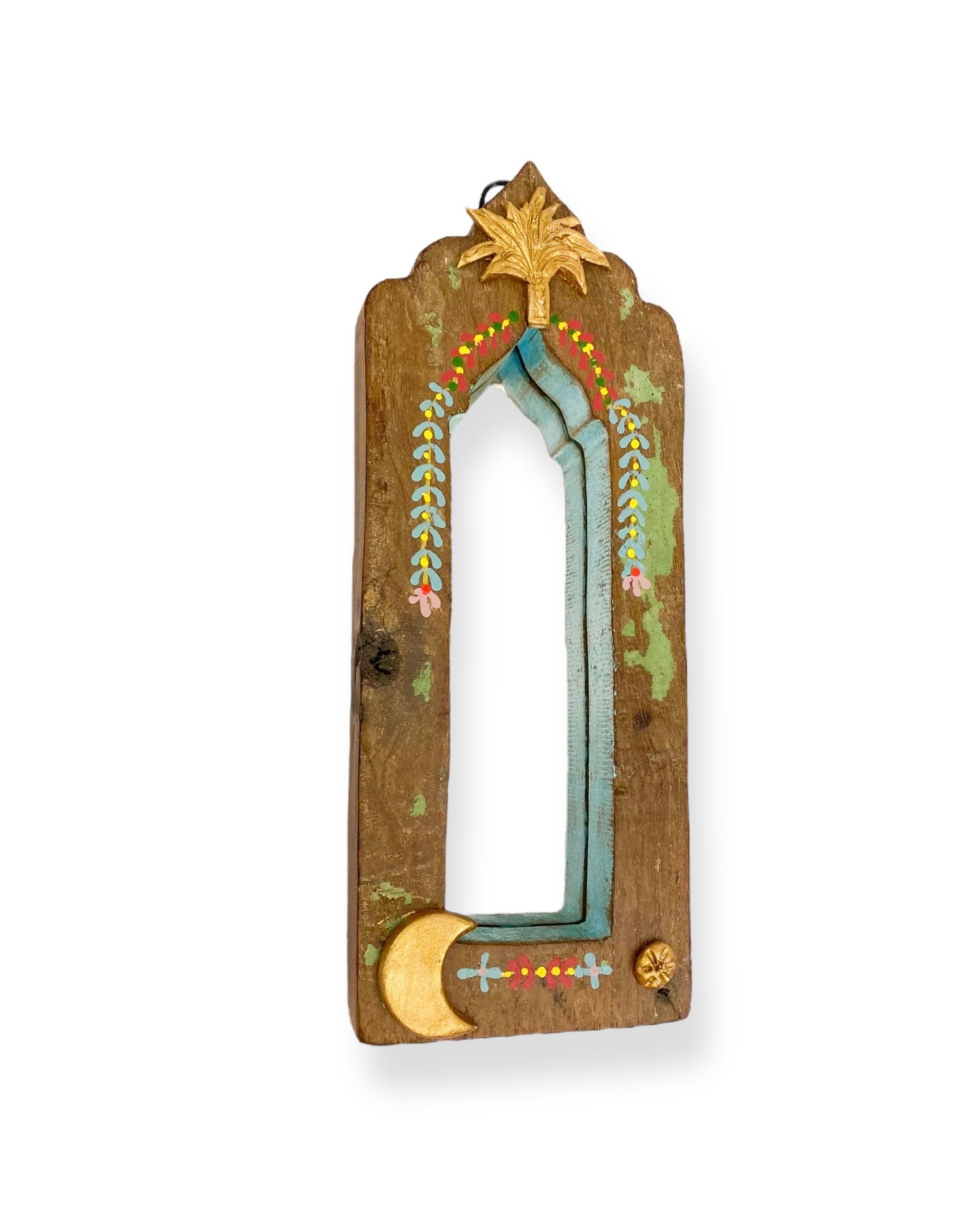 Deze houten spiegel is een kunstwerk voor aan de muur. Het is een vintage houten spiegel uit India die we zelf hebben geupcycled met unieke schilderingen. Hierdoor is iedere spiegel uniek.
