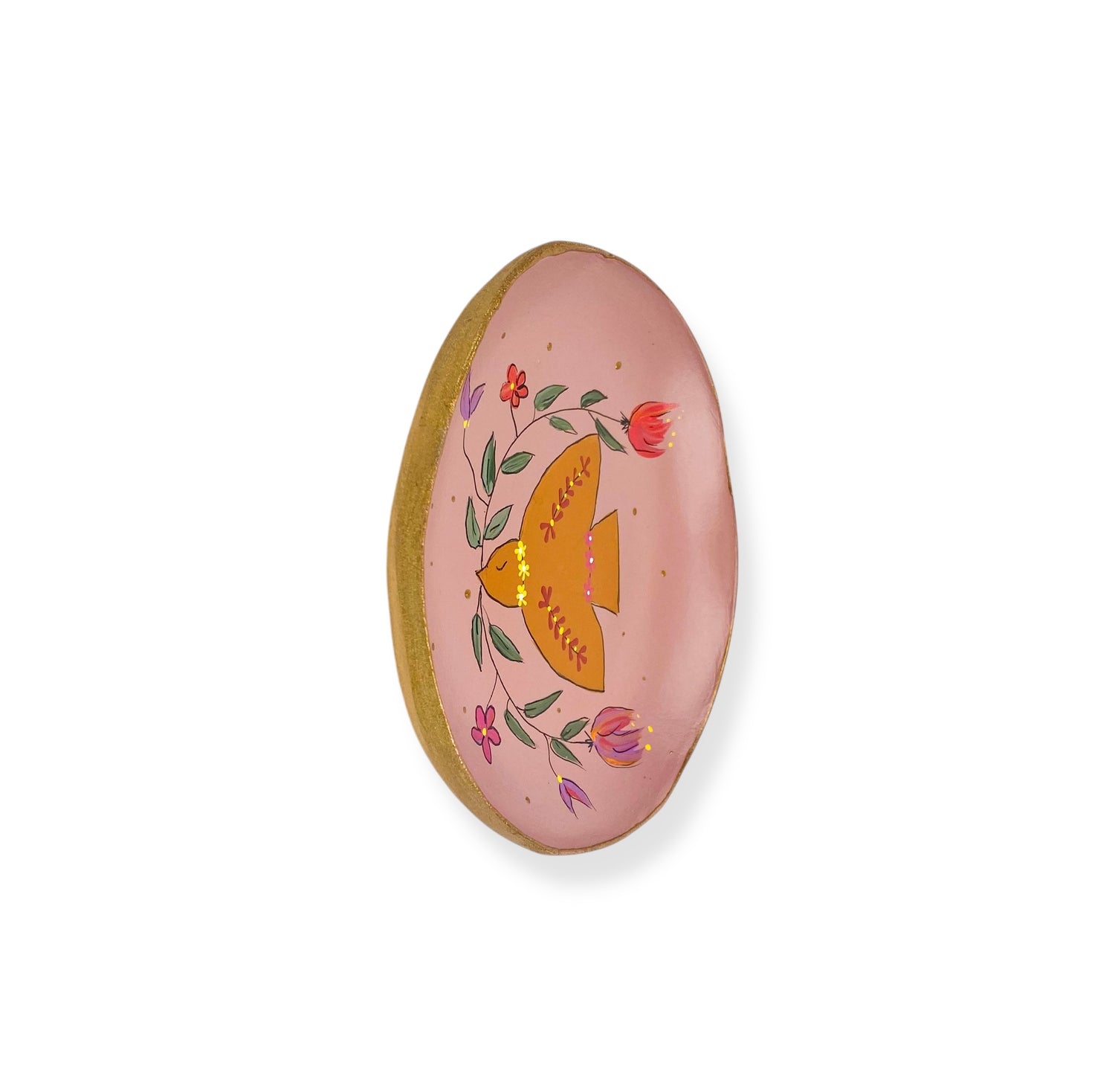 Dit wandbord is een kunstwerk voor aan de muur. Het is volledig met de hand gemaakt van klei, door shopeigenaresse Irma in ons atelier in Haps. Het wandbord is versierd met roze schilderingen, bloemen, een gouden zwaluw en heeft een haakje waarmee je het kan ophangen aan de muur. Geef het wandbord een mooi plekje in huis of combineer het met andere handgemaakte wanddecoratie, zoals een wandtegeltje, mini nisje of altaar. Getipt door vtwonen en Happinez!
