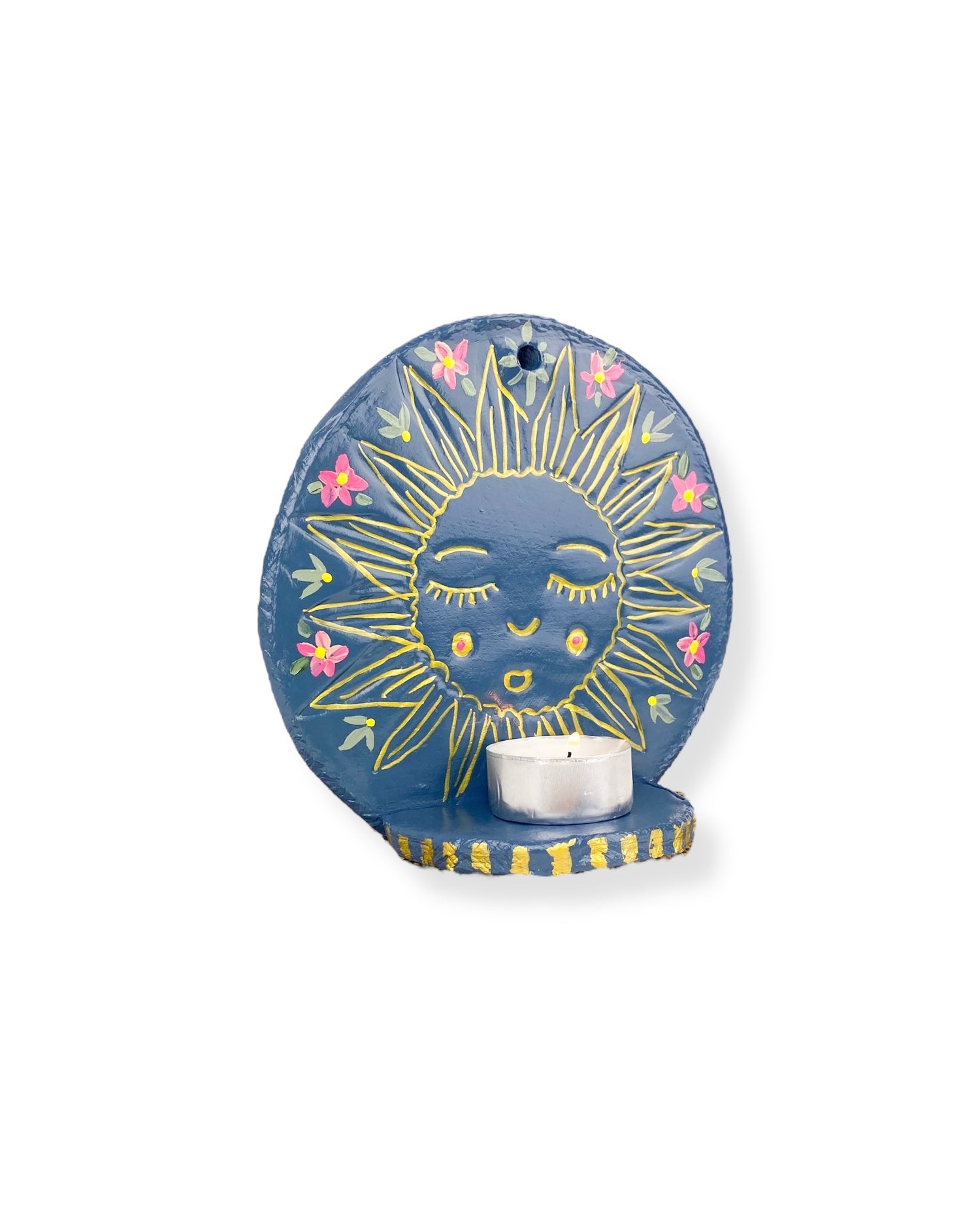 Deze waxinelichthouder is een klein kunstwerkje voor aan de muur. Het is volledig met de hand gemaakt van klei door shop eigenaresse Irma in ons atelier. Je kan de waxinelichthouder ophangen aan de muur en je kan er een kaarsje op branden. Geef de waxinelichthouder een mooi plekje aan de muur of combineer het met andere handgemaakte wanddecoratie, zoals een wandtegeltje, wandbord of altaar.