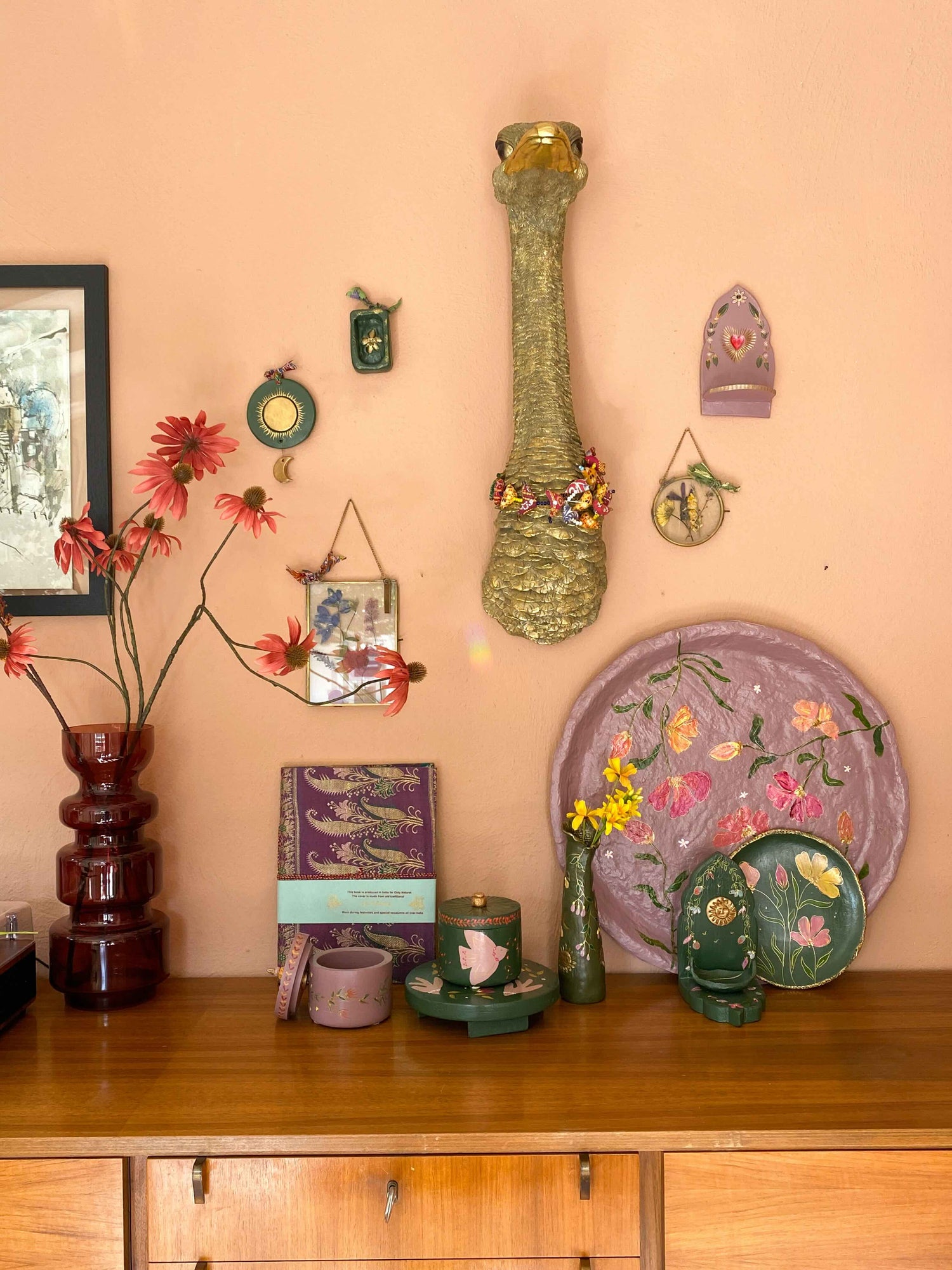 Deze ronde schaal / XXL wandbord is beschilderd door shopeigenaresse Irma in ons atelier. Gebruik de schaal bijvoorbeeld als huisaltaar en creëer een eigen plekje in huis voor rust, dankbaarheid of bezinning. Of decoreer de schaal met sfeervolle items zoals een waxinelichthouder of verse bloemen. Hij heeft ook een haakje aan de achterkant waarmee je hem op kan hangen aan de muur.